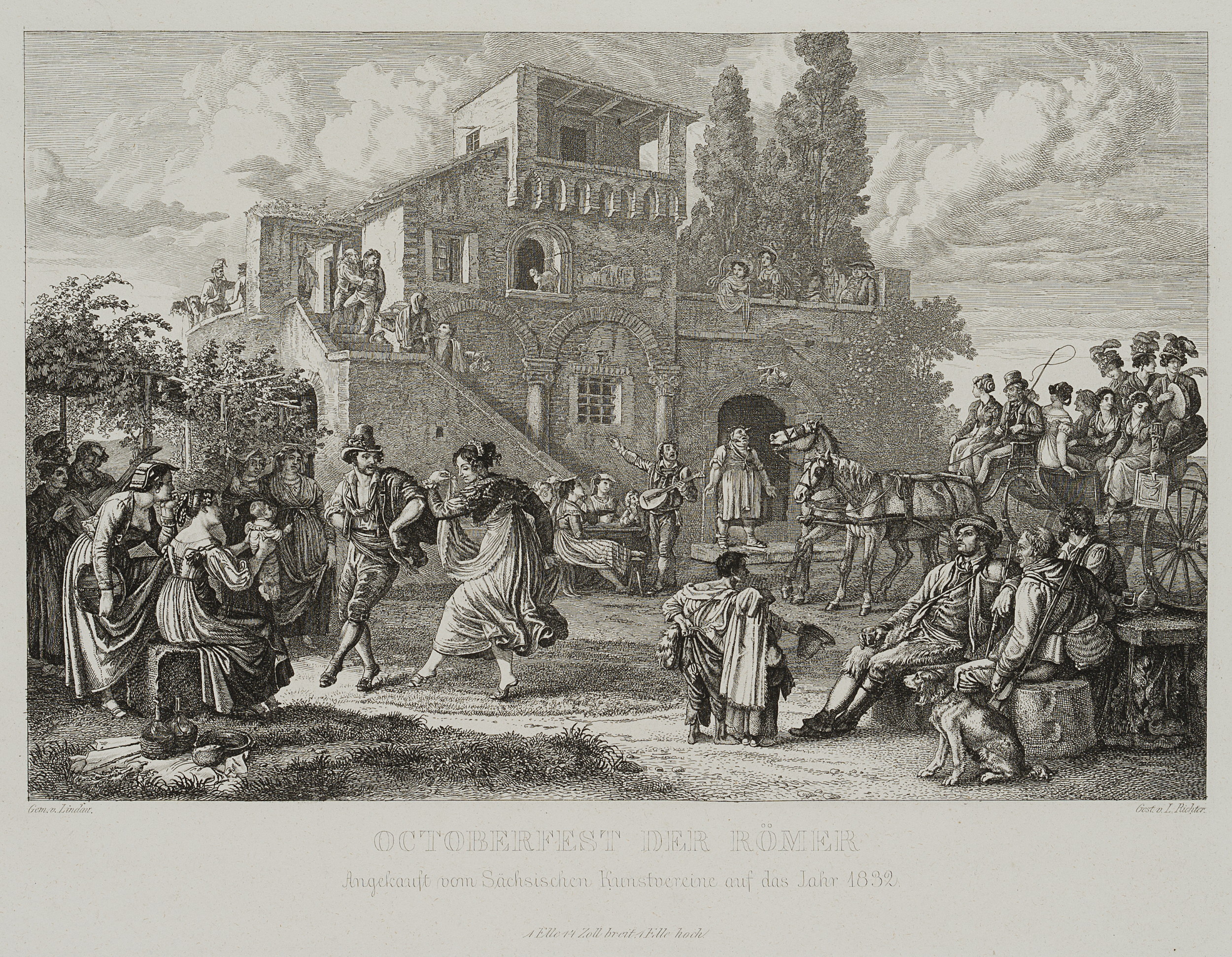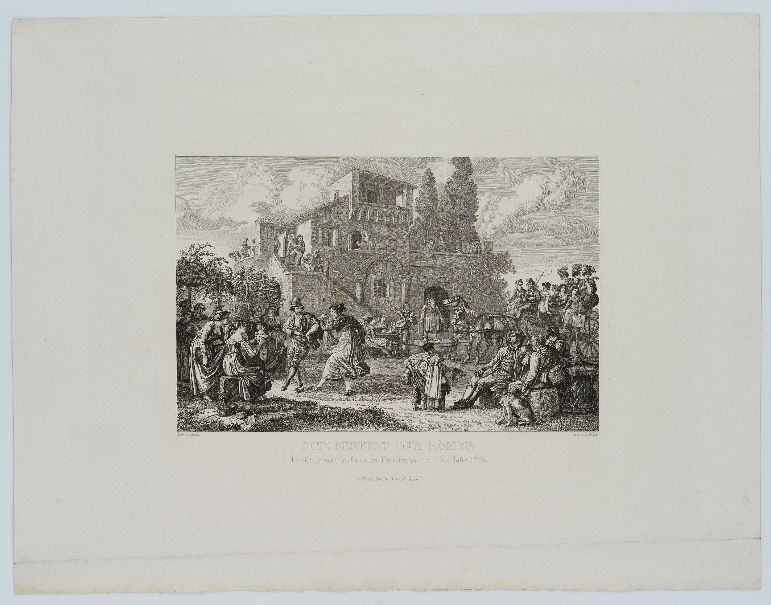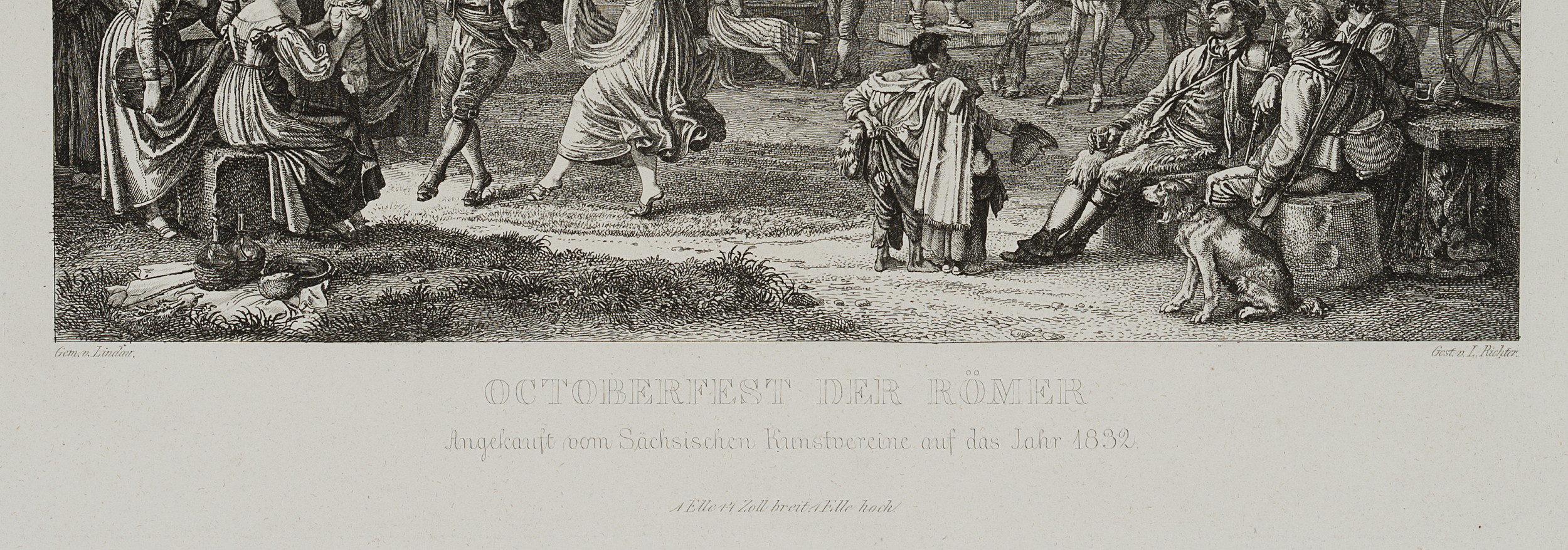 - Bezeichnung: Unten im Druck signiert: “Gem. v. Lindau | Gest. v. L. Richter”. Unten im Druck bezeichnet: “Octoberfest der Römer | Angekauft vom Sächsischen Kunstverein auf das Jahr 1832”.