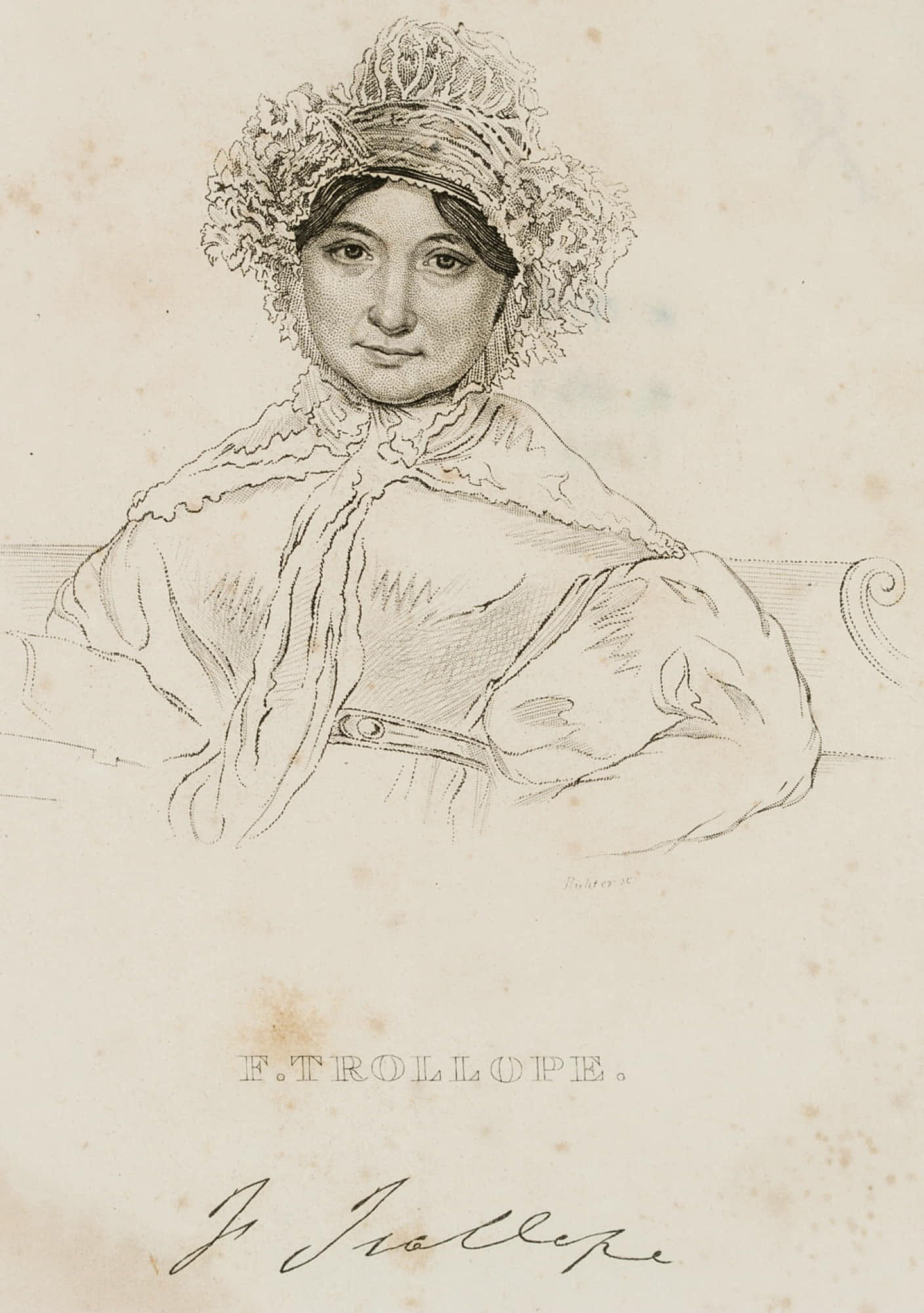 - Inscription: Signed “Richter sc” on the right below the picture, inscribed with the sitter’s name “F. TROLLOPE.” and her facsimile signature below.