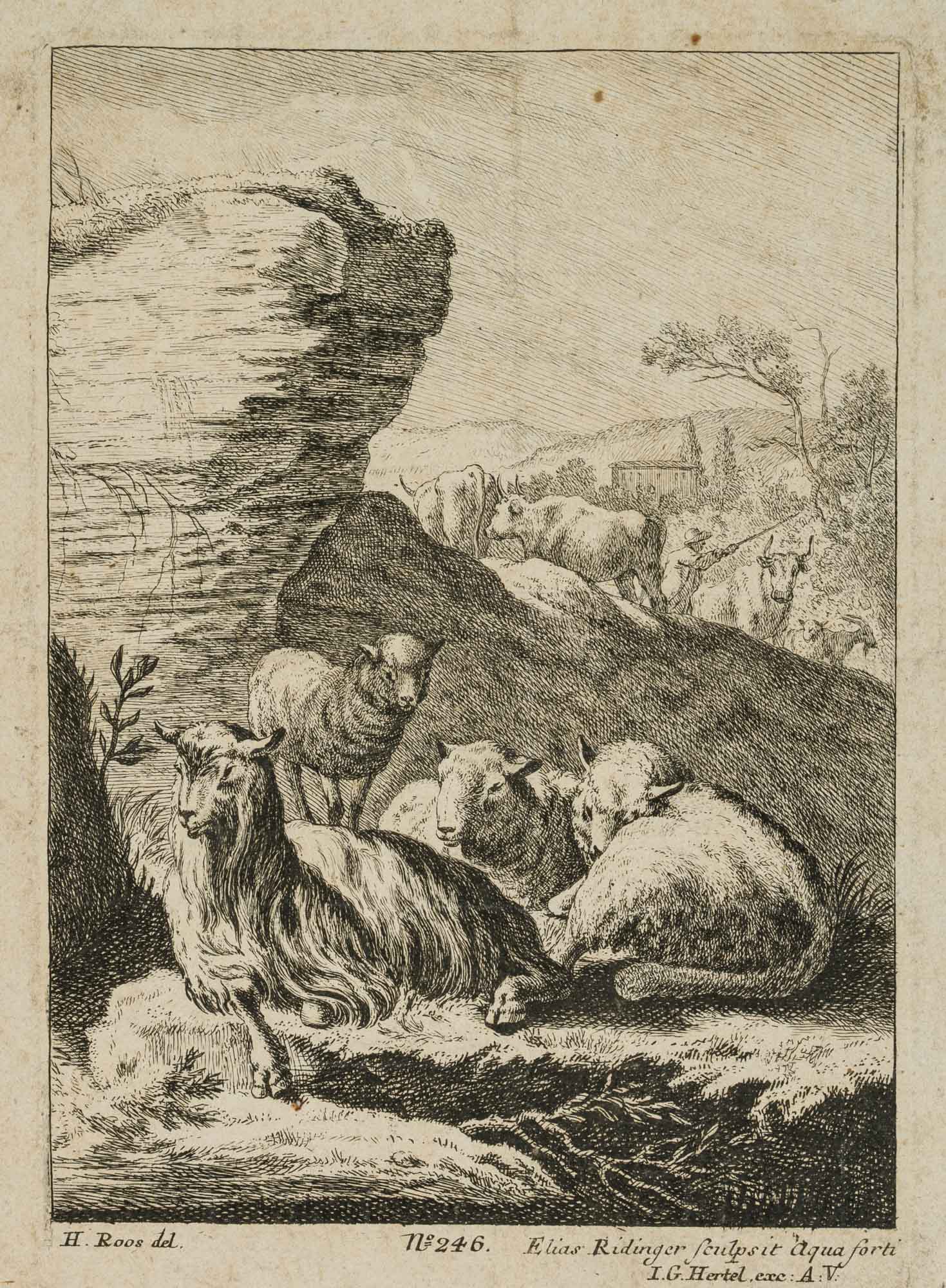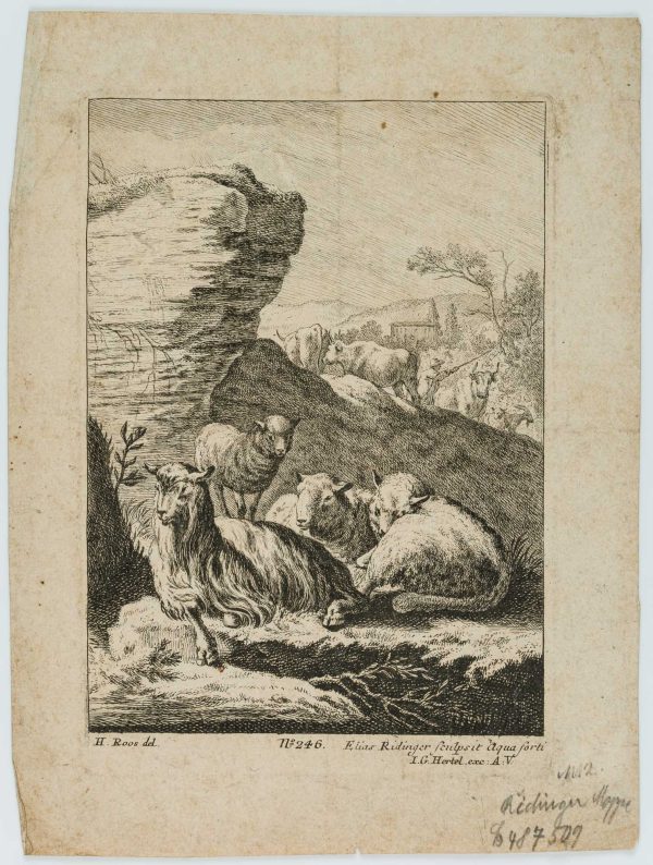 - Bezeichnung: Unterhalb der Darstellung signiert, nummeriert und bezeichnet: “H. Roos del. / No. 246. / Elias Ridinger sculpsit aqua forti / I.G. Hertel exc. A.V.”; im unteren rechten Randbereich nachträglich mit Sammlungsnummer versehen: “487509”. Aus der Hand von Johann Elias Ridinger – Tiermaler, Kupferstecher, Radierer und Verleger. Ridinger wurde von seinem zeichnerisch begabten Vater Christoph Rasch in Ulm und von Johann Falch in Augsburg unterrichtet. Seine radierten Blätter, die sich auf etwa 1600 Stück belaufen, stellen die Tiere in charakteristischen Lebensmomenten und landschaftlichen Umgebungen dar. Alte Abdrucke der Blätter sind selten. Eine Ausgabe als „Galerie Ridingerscher Tier- und Jagdstücke“ wurde 1817 in Augsburg begonnen. Sehr zahlreich sind seine mit Genauigkeit und Geschmack ausgeführten Zeichnungen. Johann Elias Ridinger schuf mit rund 1600 Kupferstichen und Radierungen ein umfassendes Werk barocker Druckkunst. Sein Hauptthema waren detailgetreue Tierdarstellungen und Jagdszenen („Ridingersche Tier- und Jagdstücke“), die meisten seiner Bilder erschienen im von ihm selbst gegründeten Kunstverlag in Augsburg.