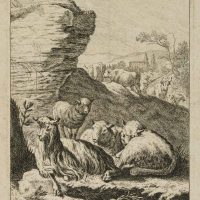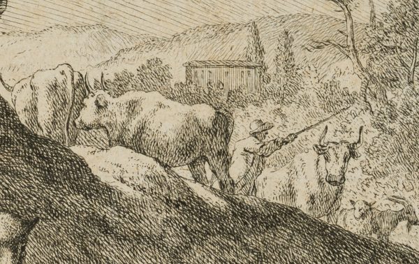 - Description: Very nice etching of an idyllic landscape showing a shepherd with his cattle lying under a rocky outcrop in the afternoon sun.