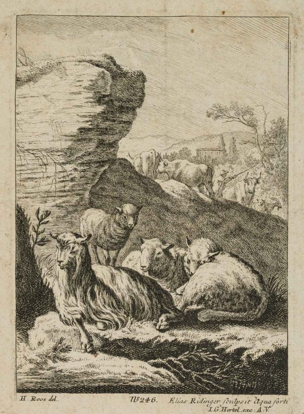 - Inscription: Signed, numbered and inscribed below the image: “H. Roos del. / No. 246. / Elias Ridinger sculpsit aqua forti / I.G. Hertel exc. A.V.”; in the lower right margin subsequently provided with collection number: “487509”. From the hand of Johann Elias Ridinger – animal painter, engraver, etcher and publisher. Ridinger was taught by his father Christoph Rasch in Ulm and by Johann Falch in Augsburg. His etched sheets, which number about 1600, depict animals in characteristic moments of life and scenic surroundings. Old prints of the sheets are rare. An edition as ‘Galerie Ridingerscher Tier- und Jagdstücke’ was started in Augsburg in 1817. His drawings, executed with accuracy and taste, are very numerous. Johann Elias Ridinger created with about 1600 copper engravings and etchings a comprehensive work of baroque printmaking. His main theme was detailed depictions of animals and hunting scenes (“Ridinger’s Animal and Hunting Pieces”), most of his pictures were published by the art publishing house he founded himself in Augsburg.