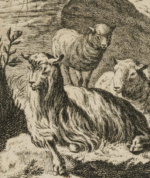 - Beschreibung: Sehr schöne Radierung einer idyllischen Landschaft, die einen Hirten mit seinem Vieh zeigt, das unter einer Felsnase in der Nachmittagssonne liegt.