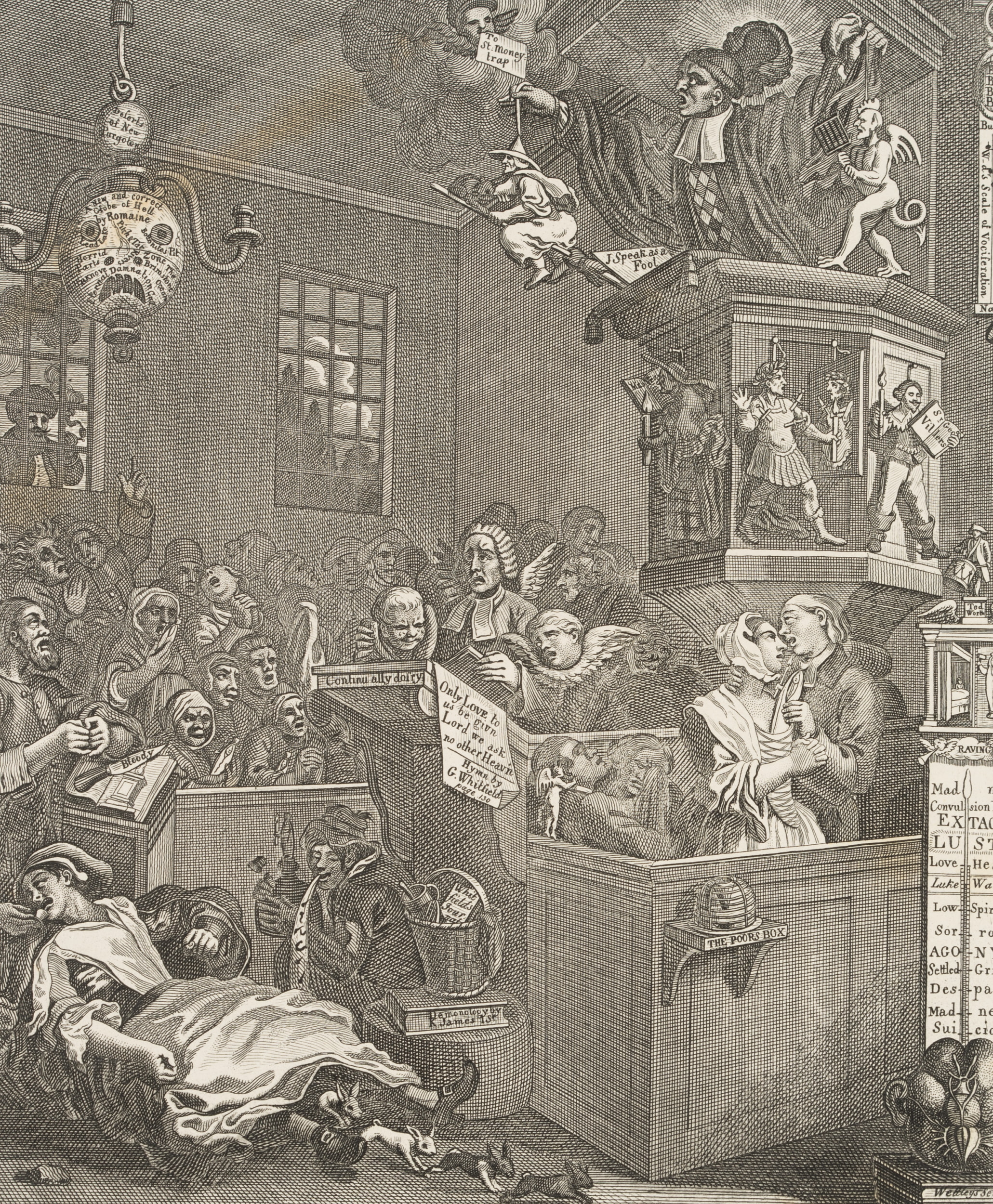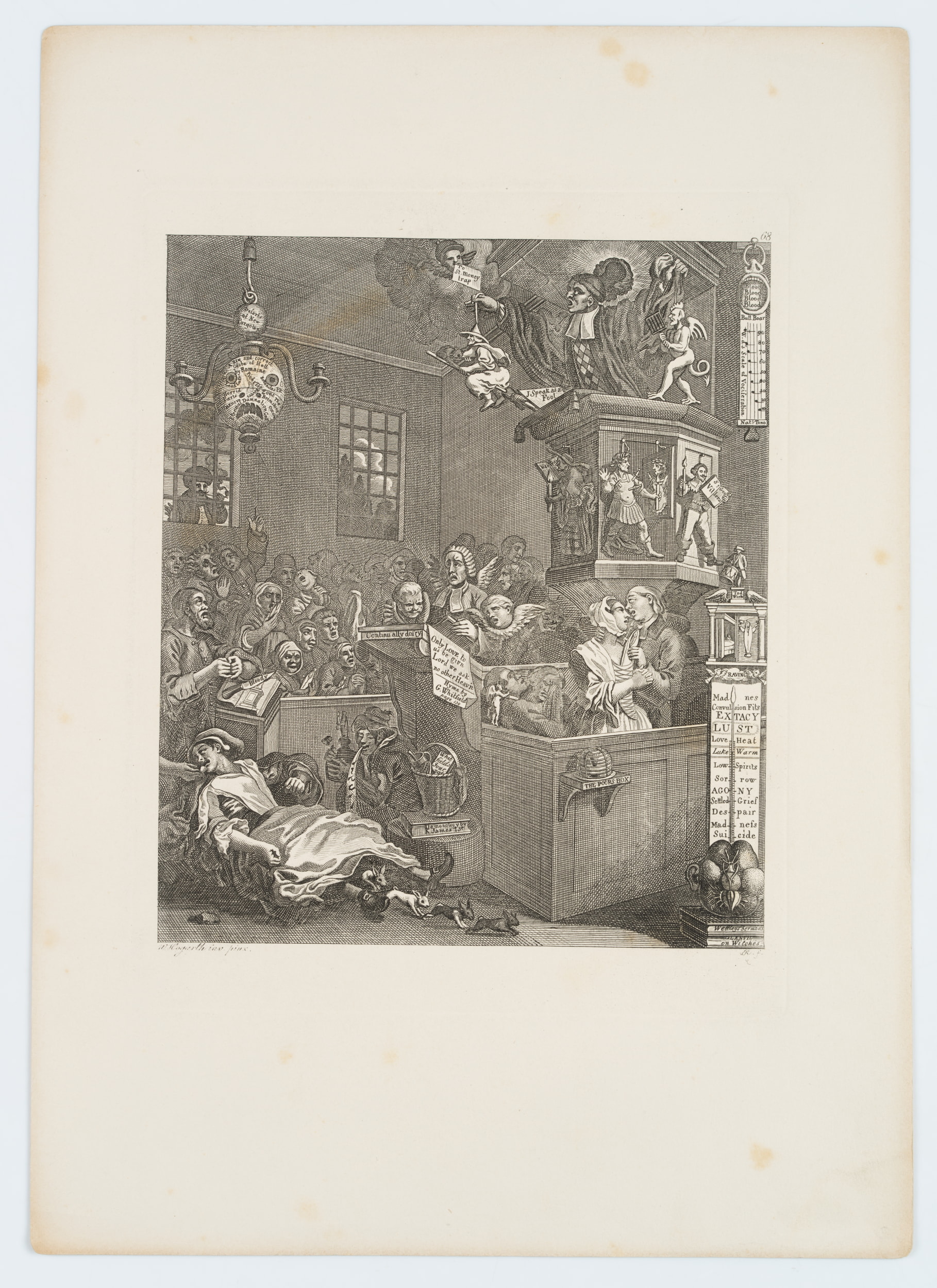 - Description: During a well-attended mass. At the top right is the pastor, preaching from a high pulpit on the right. Under his priestly robe he wears a jester’s suit and holds the doll of a witch in one hand and that of a devil in the other. On the far right of the picture is a religious thermometer that is supposed to indicate the emotional state of the brain. Those present let themselves be carried away by the sermon. They are in different stages of ecstasy, fear and sadness. In the middle of the picture, another priest is singing, accompanied by two boys dressed as angels. In the lower left of the picture, Hogarth heightens the scene into the grotesque. In the corner a woman is lying on the floor, rabbits are running out from under her skirt. The shoeshine boy next to her vomits nails and needles.