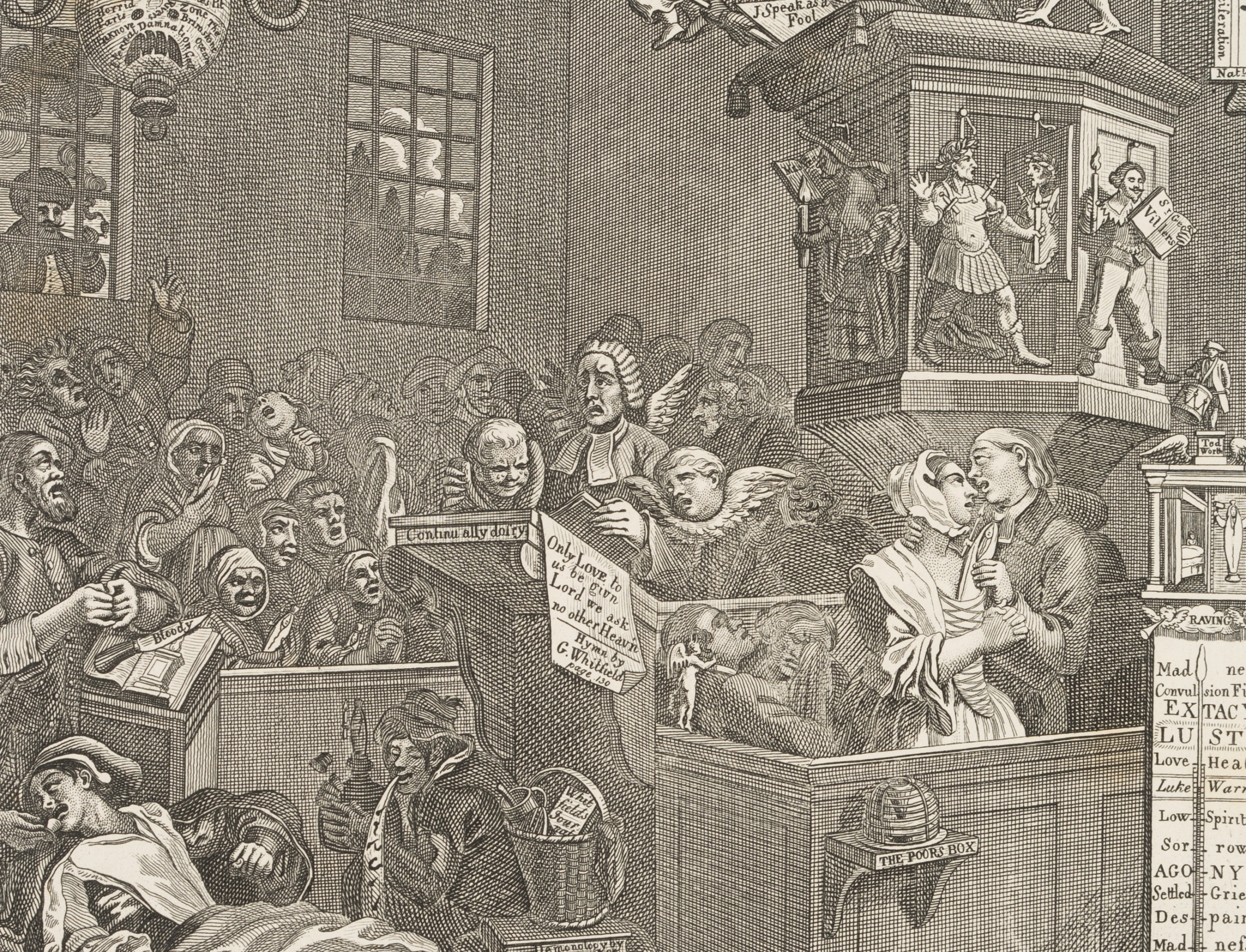 - Beschreibung: Während einer gut besuchten Messe. Oben rechts befindet sich der Pastor und predigt rechts von einer hohen Kanzel. Unter seiner Priesterrobe trägt er einen Narrenanzug und hält in einer Hand die Puppe einer Hexe und in der anderen die eines Teufels. Ganz rechts im Bild befindet sich ein religiöses Thermometer, dass den emotionalen Zustand des Gehirns anzeigen soll. Die Anwesenden lassen sich von der Predigt mitreißen. Sie befinden sich in unterschiedlichen Stadien von Ekstase, Angst und Trauer. In der Mitte des Bildes singt ein weiterer Priester, begleitet von zwei als Engel verkleidete Jungen. Links unten im Bild steigert Hogarth die Szene ins Groteske. In der Ecke liegt eine Frau auf dem Boden, unter ihrem Rock rennen Kaninchen hervor. Der Schuhputzer neben ihr erbricht Nägel und Nadeln.