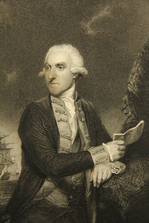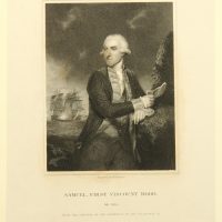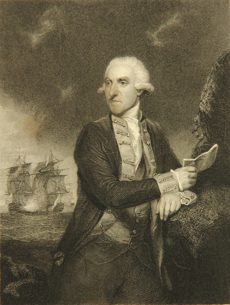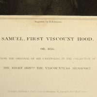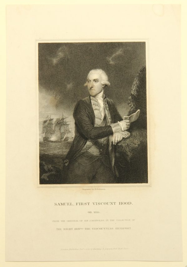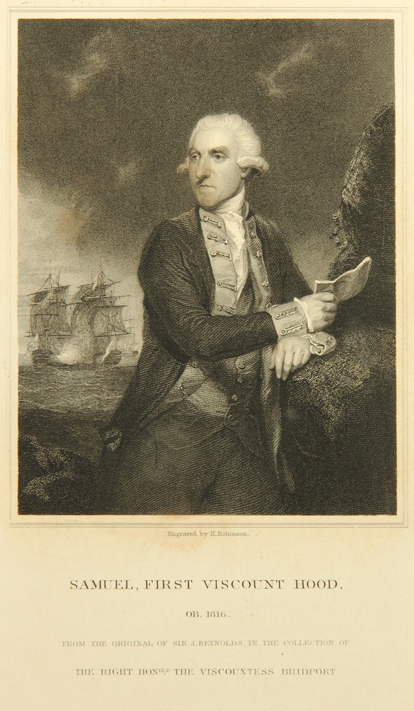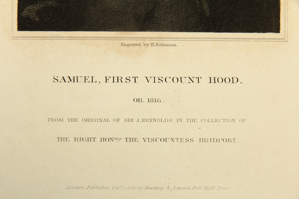 John Henry Robinson (1796 – 1871 ) after Joshua Reynolds (1723 Plymouth – 1792 London), Portrait of the British Admiral of the Royal Navy Samuel Hood, 1st Viscount Hood (1724 – 1816 Bath), as Rear Admiral Commander in the Caribbean during the American War of Independence from 1775 to 1783 and from 1793 Commander-in-Chief of the British Mediterranean Squadron, c. 1836, Etching