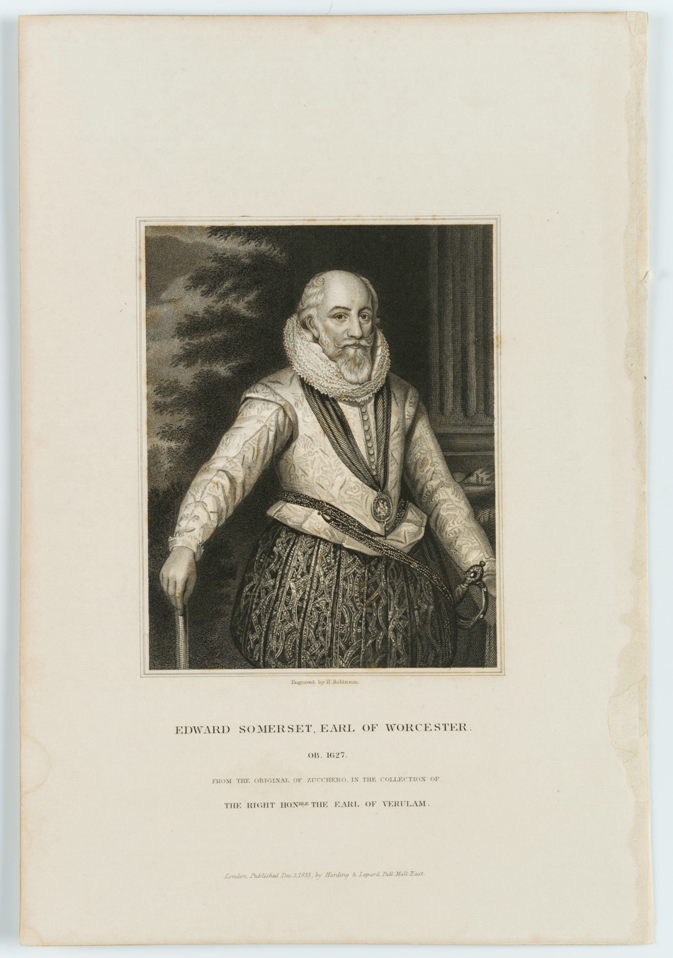 - Bezeichnung: Unten signiert und betitelt: “Edward Somerset, Earl of Worcester. OB. 1627. From the Original of Zucchero. in the collection of The Right Honble. The Earl of Verulam.”