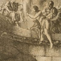 Johann Matthias Schröckh (1733 Wien – 1808 Wittenberg) war ein deutscher Historiker und Literaturwissenschaftler, Dichter und Arzt; Illustration zu Schröckhs “Allgemeiner Weltgeschichte für Kinder”, die er in vier Teilen von 1779 bis 1784 in Leipzig herausgegeben hatte. Er betrachtete seine “Weltgeschichte” als Art Lesebuch für Kinder mit Schilderungen aus der alten Geschichte, der Religionsgeschichte und der deutschen sowie europäischen Geschichte, die mit zahlreichen Kupferstichen nach Zeichnungen Bernhard Rodes illustriert wurden. Rodes Illustrationen belegen sehr schön seine Fähigkeit, besondere oder ungewöhnliche historische und literarische Themen bildlich umzusetzen, ohne dabei auf Vorbilder zurückgreifen zu können. - Datierung: 18. Jahrhundert