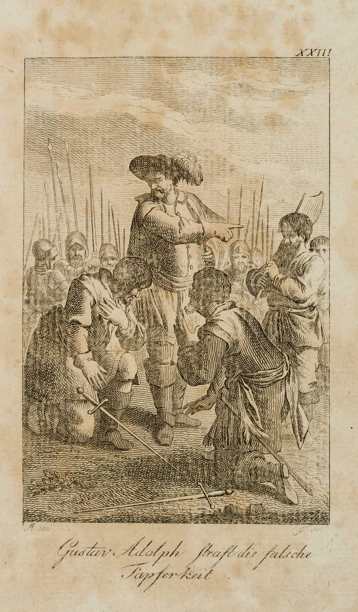 - Inscription: Inscribed below the image on the left: “R. inv.” and “G. sc.”, titled below “Gustav Adolph straft die falsche Tapferkeit.”; numbered “XXIII” on the upper right.