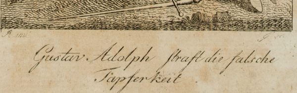- Bezeichnung: Unterhalb der Darstellung links bezeichnet: “R. inv.” und “G. sc.”, darunter betitelt “Gustav Adolph straft die falsche Tapferkeit.”; oben rechts nummeriert “XXIII”.