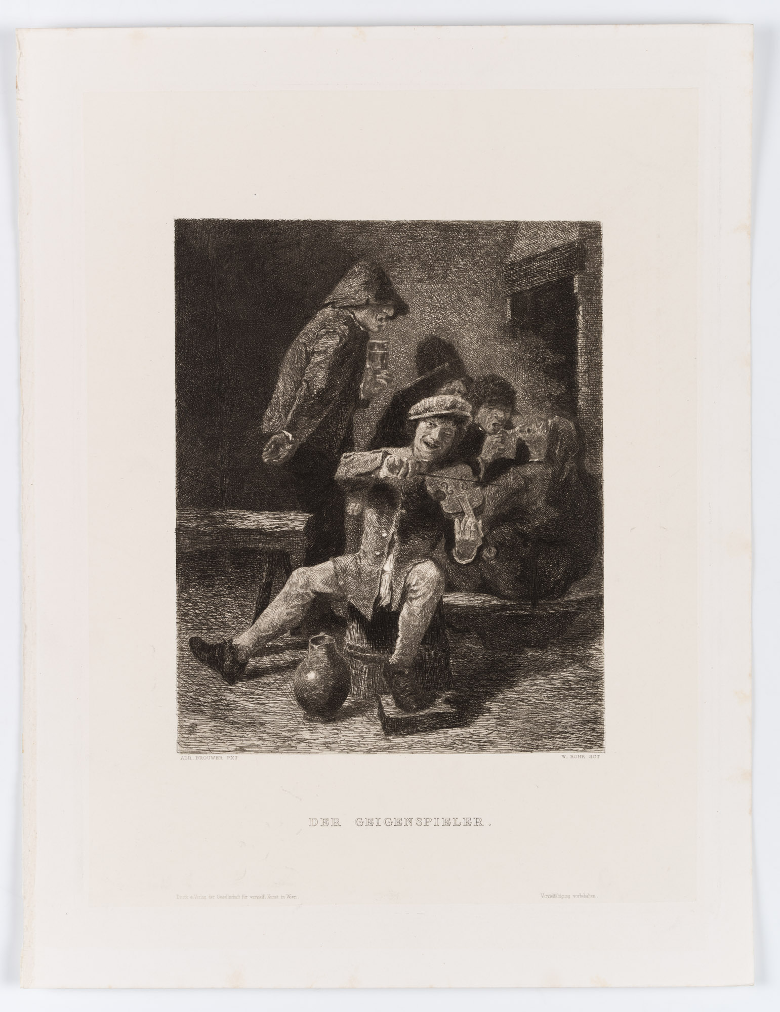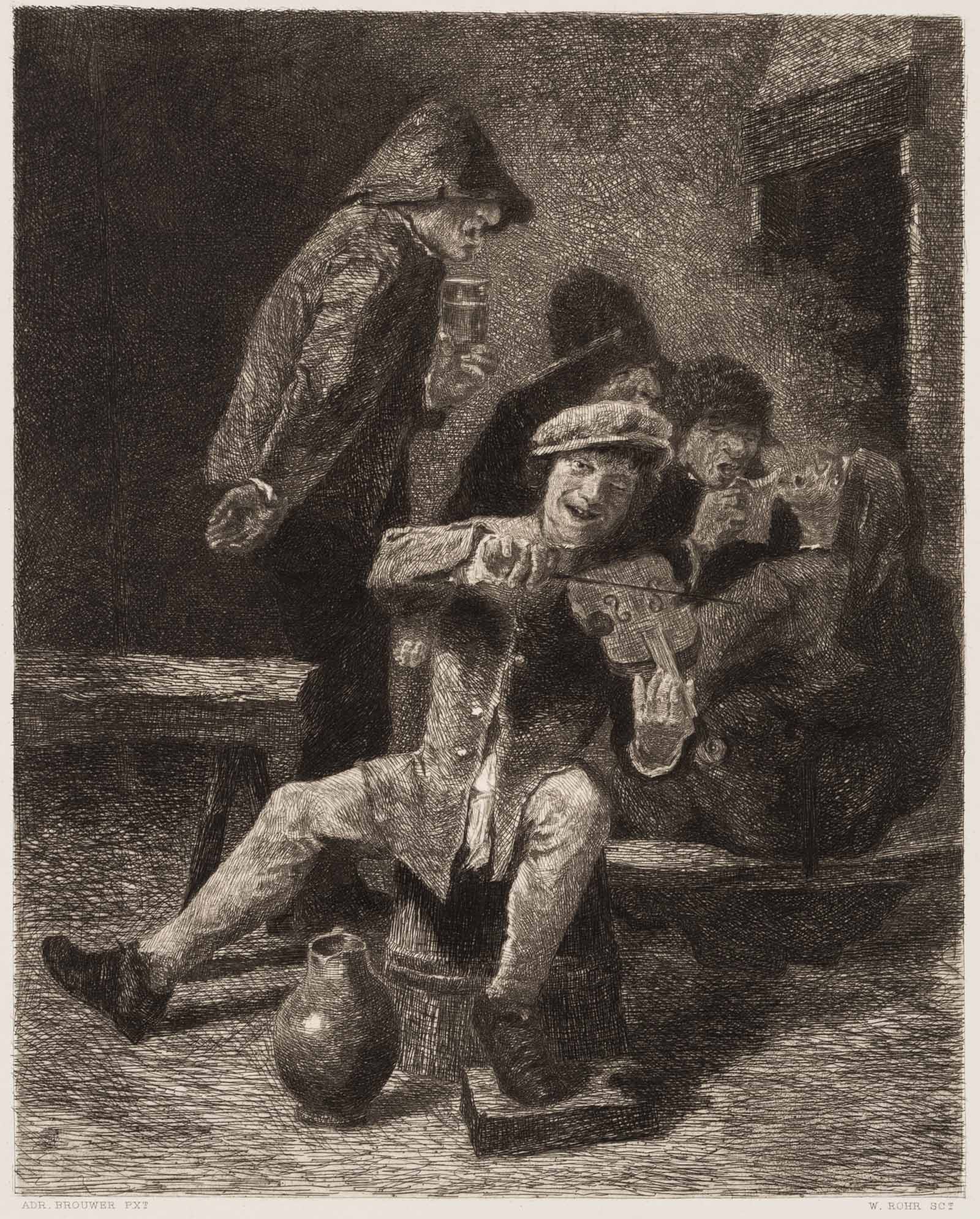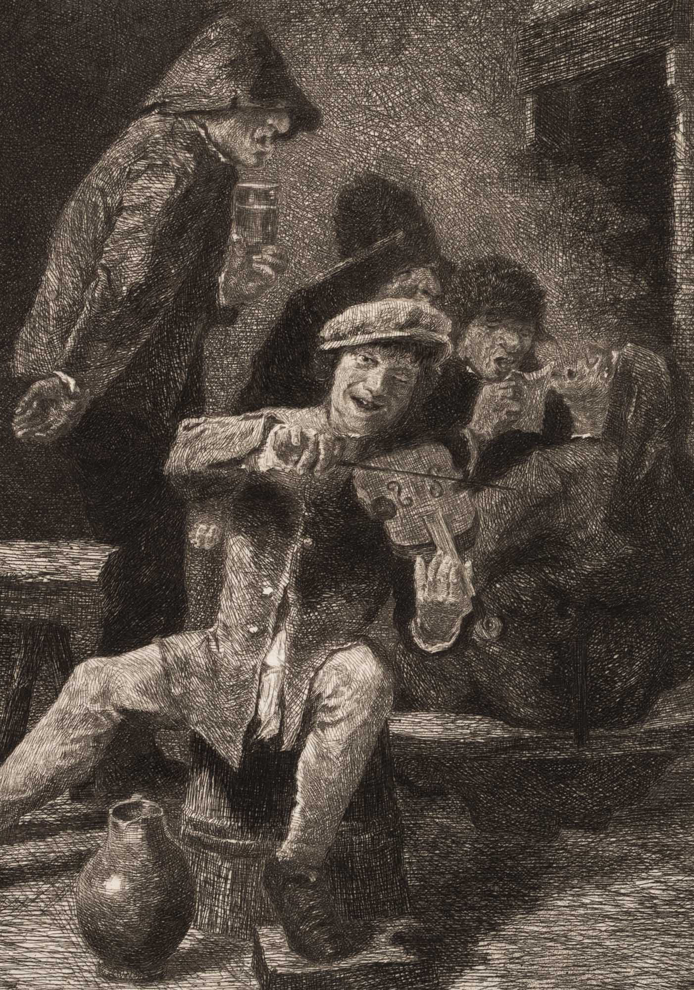 Wilhelm Rohr (1848 Leipzig – 1907 München) nach Adrian Brouwer (1605 Oudenaarde – 1638 Antwerpen), Wirtshausszene mit Geigenspieler und Trinkgelage, 19. Jahrhundert, Radierung