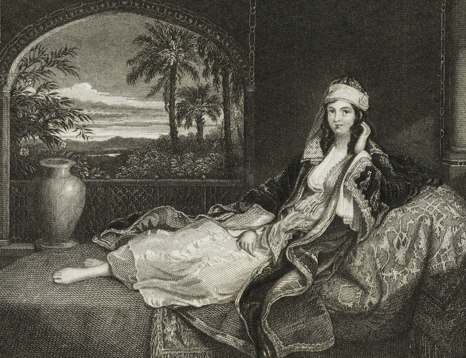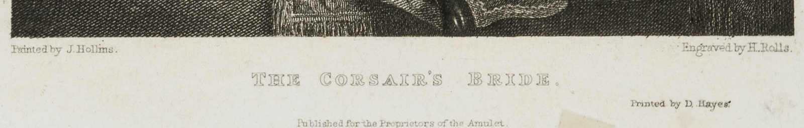 - Description: Titled and inscribed under the picture: “Painted by J. Hollins.”, “Engraved by H. Rolls.”, “Printed by D. Hayes” and publication line: “Published for the Proprietors of the Amulet”. Inscription in another hand on the verso: H. ROLLS c. 1820″ and numbering: “635” as well as illegible collector’s name. Woman in oriental dress lying on a sofa, looking out of an arched window in the left background; after John Hollins; illustration to a poem “The Corsair’s Bride” by Frederick Muller, in Amulet of 1829, p. 296.