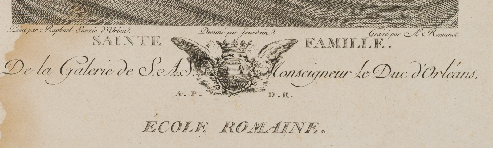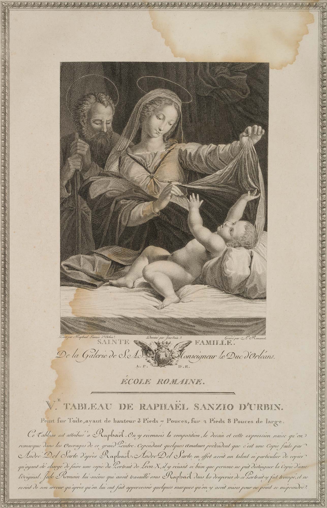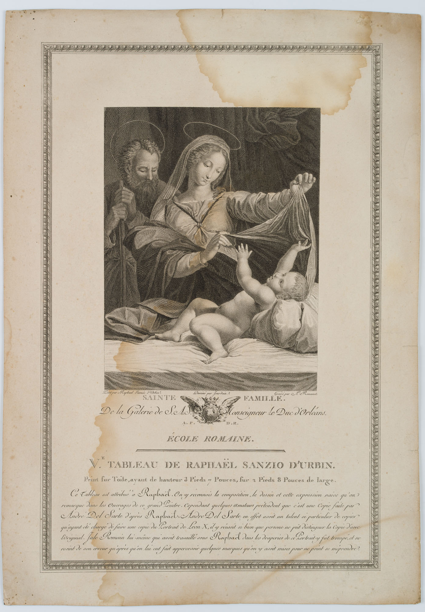 • Description: Signed below: ‘Peint par Raphael Sanzio d’Urbin’, ‘Dessiné par Jourdain’ and ‘Gravé par A. Romanet.’; titled and inscribed at lower centre: ‘SAINT FAMILLE’, further: ‘De la Galerie de S.A.S. Monseigneur le Duc d’Orleans. / A.P.D.R. / ÉCOLE ROMANE. / VE. TABLEAU DE RAPHAËL SANZIO D’URBIN. / Peint sur Toile, ayant de hauteur 3 Pieds 7 Pouces, sur 2 Pied 8 Pouces de large’, and six lines of French inscription: ‘Ce Tableau..méprendre.’.