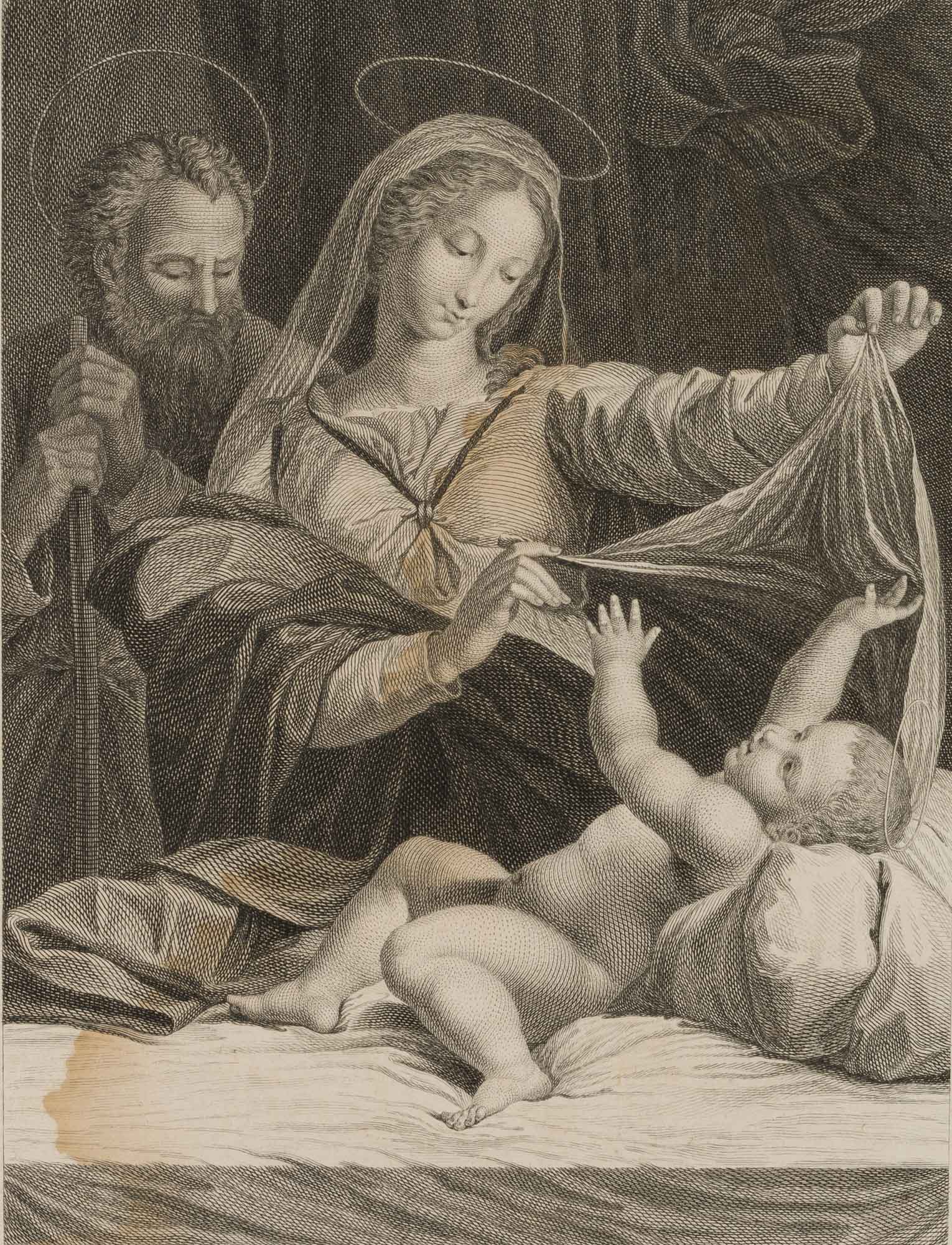 Antoine Louis Romanet (around 1742 Paris – after 1810 ) after Raffael: Raffaello Sanzio da Urbino (1483 Urbino – 1520 Rom), “Sainte Famille”, Galerie du Palais Royal, Loreto Madonna crowned with a gloriole, The Holy Family, 1786-1807, c. 1800, Copper engraving