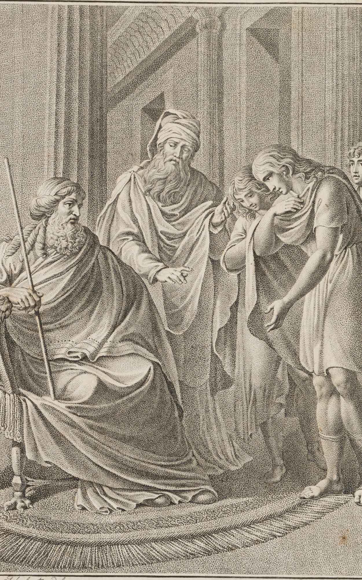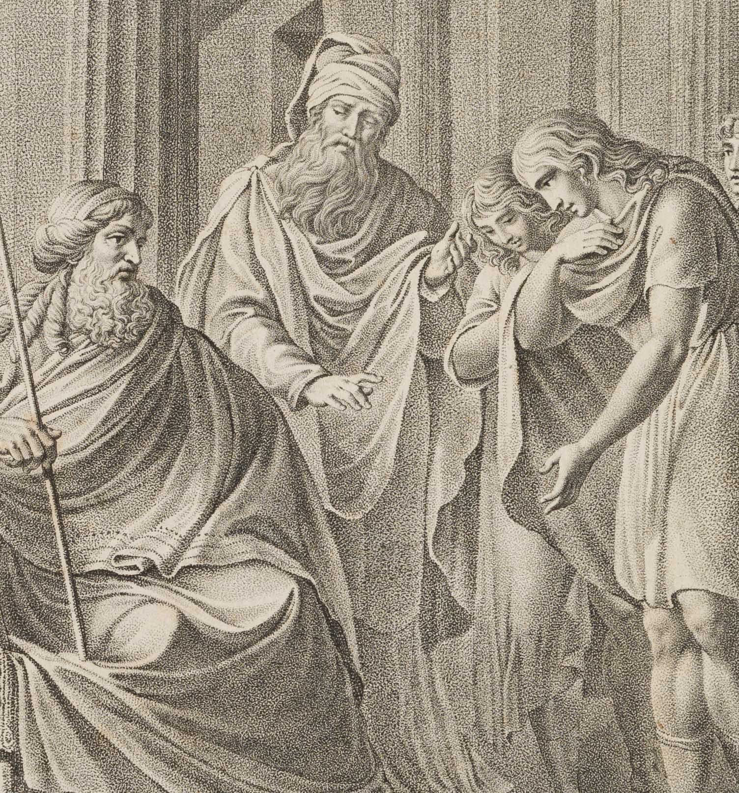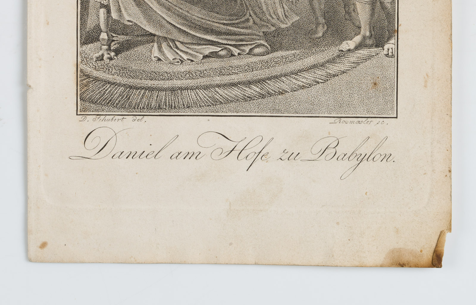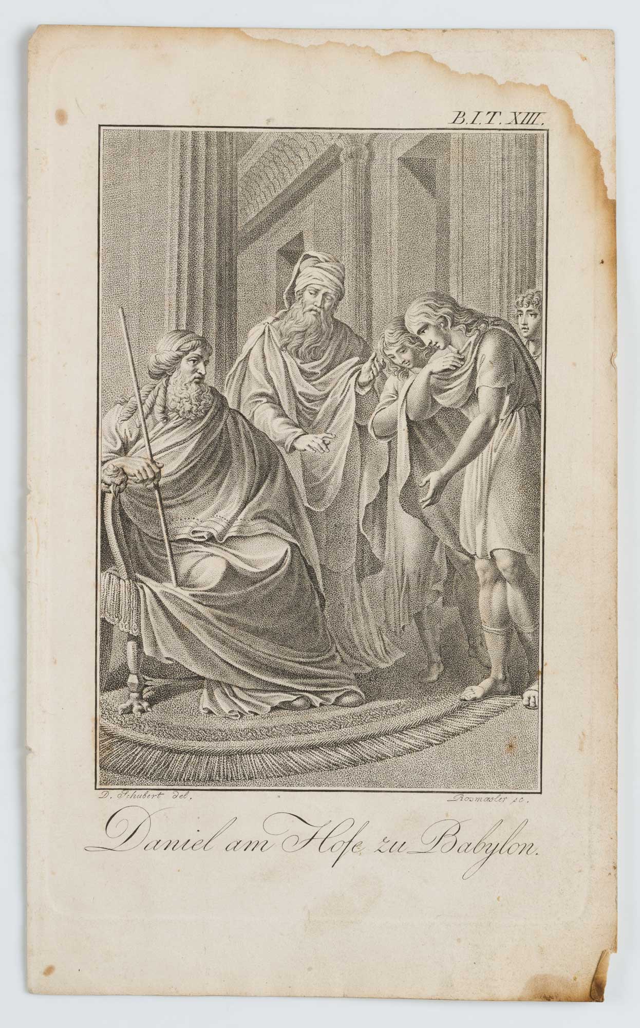 Johann August Rosmaesler (1752 Leipzig – 1783 Dresden) nach Johann David Schubert (1761 Dresden – um 1822 ebd.), Daniel am Hofe zu Babylon, 19. Jahrhundert, Kupferstich