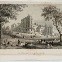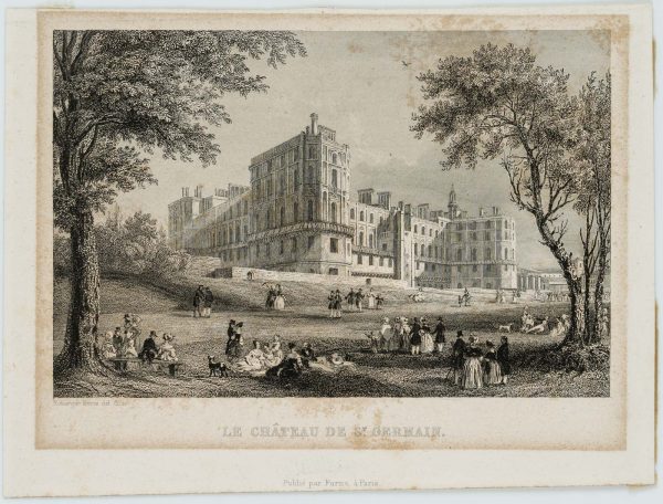 - Description: Titled in the centre below the depiction; inscribed below the depiction on the left within the plate: „Rouargue frères del. 8C sc.“. Below: „Publié par Furne, à Paris“. Very detailed and fine depiction; the viewer sees the magnificent castle complex rising on a hill in a slight view from below. In the foreground, nobly dressed ladies and men in top hats are strolling in the baroque garden of the castle, sitting on a bench or in the grass and talking. Saint-Geramain-en-Laye Castle is located in the French town of Saint-Germain-en-Laye in the department of Yvelines, about 19 kilometres west of Paris. It served as the residence of French kings until the 17th century, when Louis XIV moved his court to Versailles in 1682.