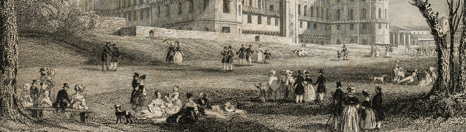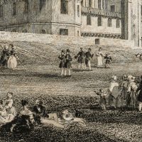 - Beschreibung: Mittig unterhalb der Darstellung betitelt; unterhalb der Darstellung links innerhalb der Platte bezeichnet: „Rouargue frères del. 8C sc.“. Darunter: „Publié par Furne, à Paris“. Sehr detailreiche und feine Darstellung; der Betrachter erblickt in leichter Untersicht die prächtige Schlossanlage, die sich auf einer Anhöhe erhebt. Im Vordergrund flanieren vornehm gekleidete Damen und Männer mit Zylinder im Barockgarten des Schlosses, sitzen auf einer Bank oder im Gras und unterhalten sich. Das Schloss Saint-Geramain-en-Laye ist in der französischen Stadt Saint-Germain-en-Laye im Département Yvelines, ca. 19 Kilometer westlich von Paris gelegen. Bis ins 17. Jahrhundert diente es als Residenz der französischen Könige, bis Ludwig XIV 1682 mit seinem Hof nach Versailles umzog.