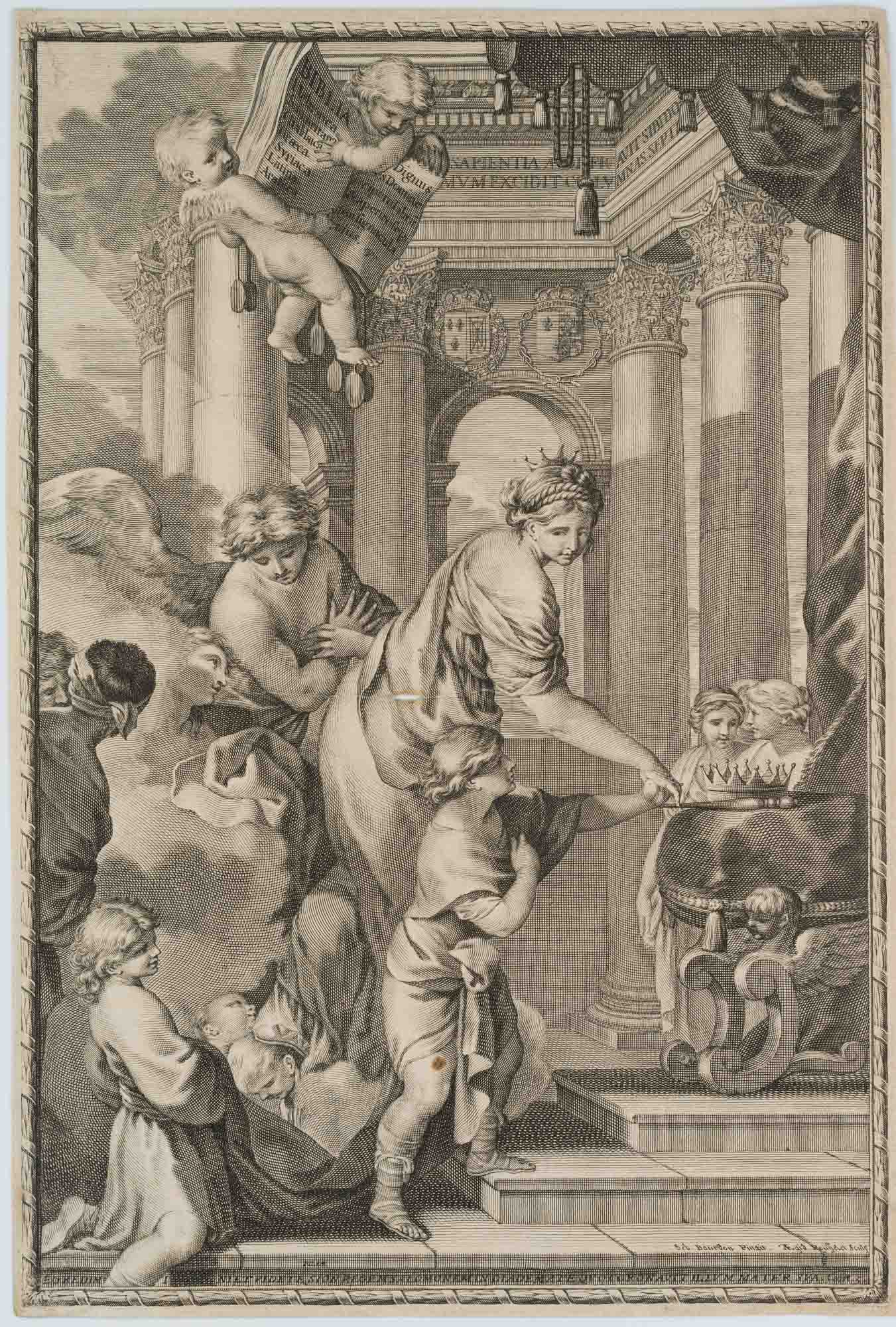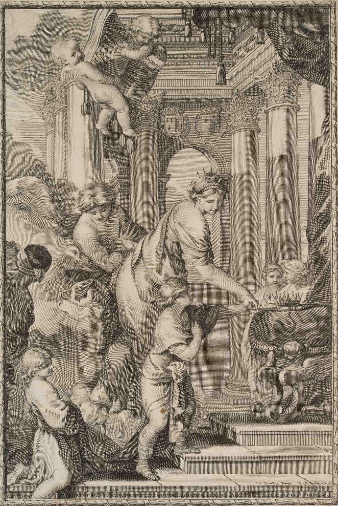 - Description: Title page of Guy Michel Le Jay’s ‘Biblia Hebraica, Samaritana, Chaldaica, Graeca, Syriaca, Latina, Arabica’. A crowned Bathsheba leads her son Salamo to a throne on which lie a crown and sceptre. Behind them angels, two putti above the scenery lift an open Bible with book title. Verso with Latin text.signed lower right in the image: “Seb. Bourdon pinxit Gil. Rousselet sculp.”.