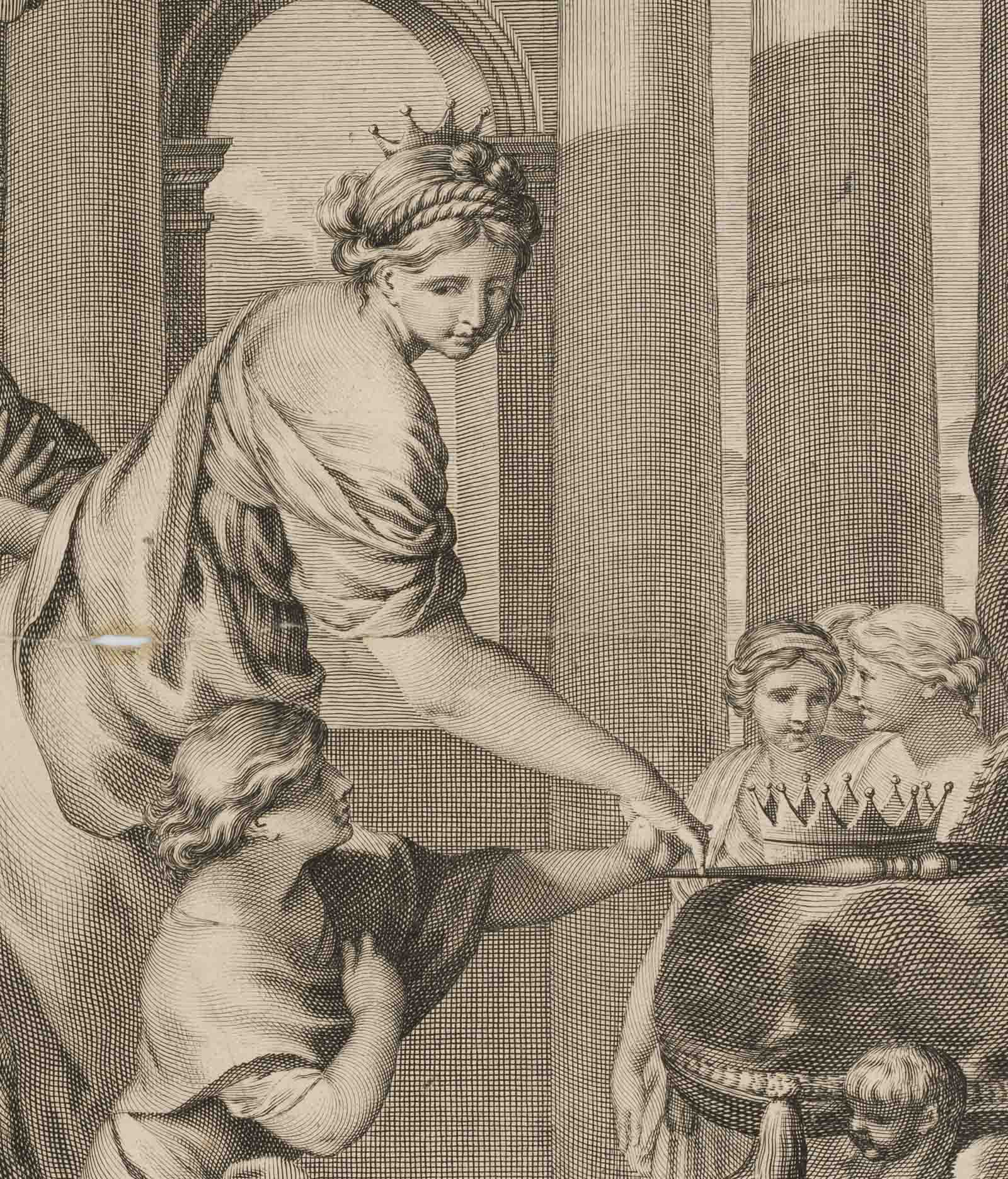Gilles Rousselet (1610 Paris – 1686 ebd.) nach Sébastian Bourdon (1616 Montpellier – 1671 Paris), Bathseba führt ihren Sohn Salomo zum Thron, um 1780, Kupferstich