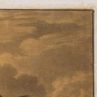 • Zustand: Akzeptabler Zustand. Das Papier ist altersbedingt verfärbt. Das Blatt ist stellenweise stockfleckig. Die Darstellung macht einen sehr guten Eindruck. Die Blattkanten sind unbeschnitten und stellenweise leicht bestoßen sowie vereinzelt eingerissen. Entlang der Kanten leicht verbräunt. Auf dem Blattrand links zwei kleine Löcher im Papier. Schwache Bereibungen und minimale Druckfehler in der Darstellung.
