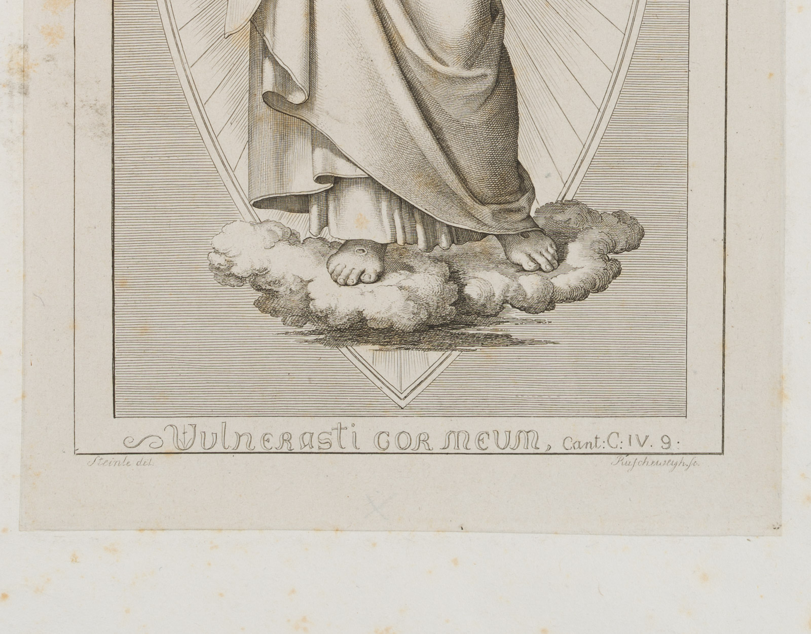 Ferdinand von Ruscheweyh (1785 Neustrelitz – 1845 ebd.) nach Edward Jakob von Steinle (1810 Wien – 1886 Frankfurt am Main), ‘Vulnerasti cor meum’, Das Herz Jesu. Darstellung Jesu mit Stigmata und geöffnetem Herzen, 19. Jahrhundert, Stahlstich