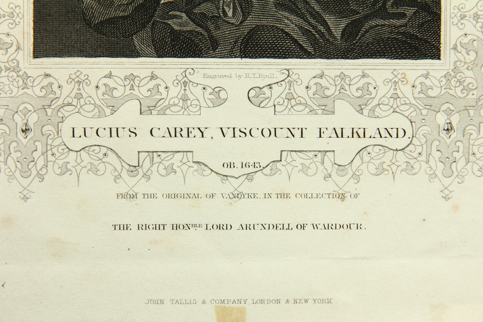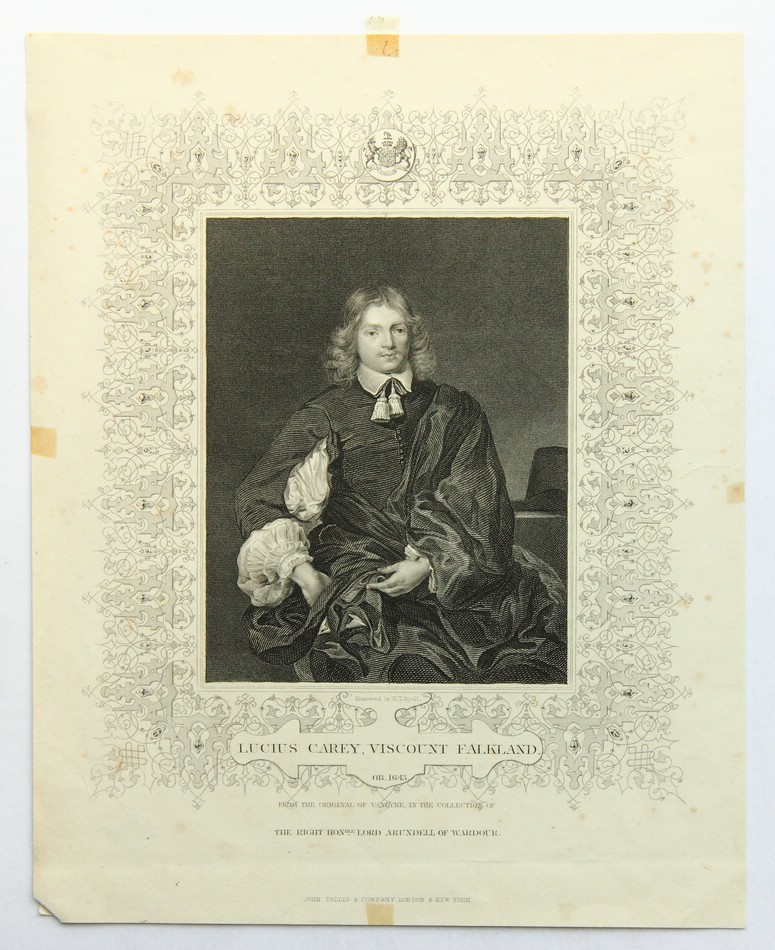 - Inscription: Signed and inscribed by the artist below the image in the printing plate: “Lucius Carey, Viscount Falkland. OB. 1643”, “From the Original of Vandyke in the Collection of the Right Honble. Lord Arundell of Wardour.”. Printed and published by “John Tallis & Company, London & New York”.