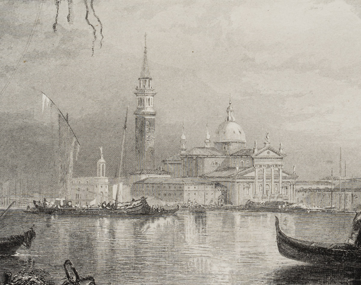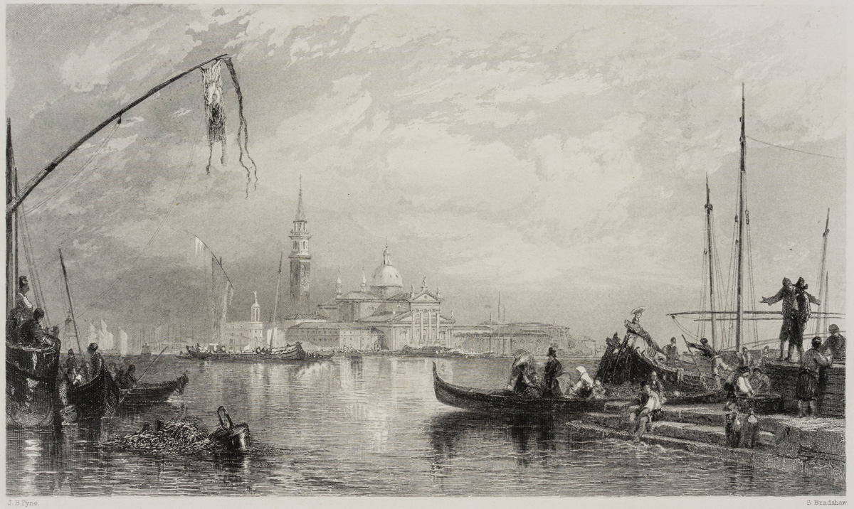 - Beschreibung: Nach einer Vorlage von James Baker Pyne (1800 Bristol – 1870 London). Malerische Darstellung mit Blick über die Lagune zur Insel San Giorgio Maggiore mit der darauf befindlichen Benediktinerabtei.