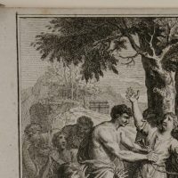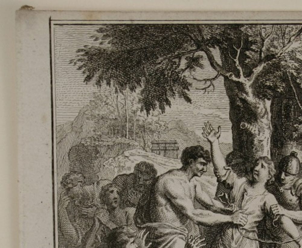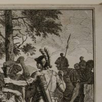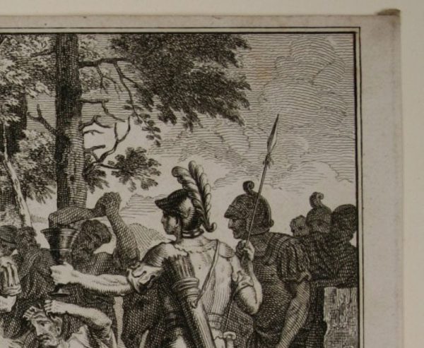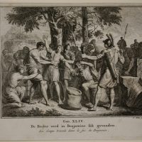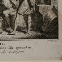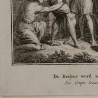 - Description: Engraving by Simon Fokke, inscribed lower right: “S. Fokke fecit”, below: “Gen. XLIV. De Beeker werd in Benjamins sak gevonden. La Coupe trouvée dans le sac de Benjamin”. In the midst of his enraged brothers, two men bind Benjamin. Triumphantly, another holds aloft the silver cup as evidence. The brothers had spent the night with their brother Joseph, but he had not made himself known to them. He wanted to check whether his brothers had reformed and pretended to have been robbed. When the brothers passionately interceded for Benjamin he was moved, revealed his name and gave them a gift. Simon Fokke (Amsterdam 1712 – Amsterdam 1784) was a Dutch draftsman, engraver and etcher.