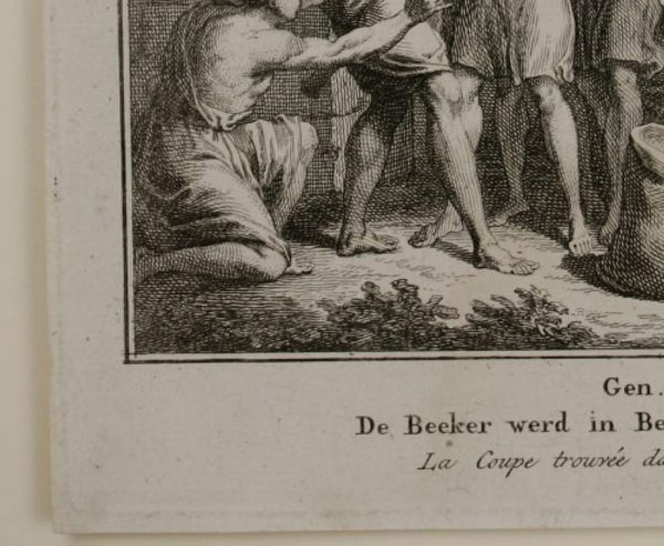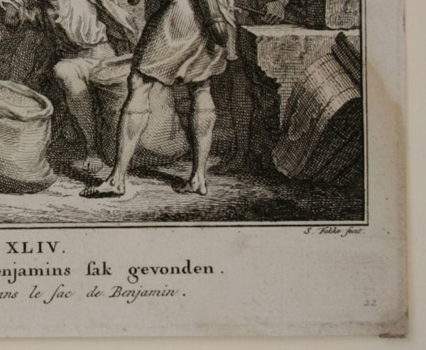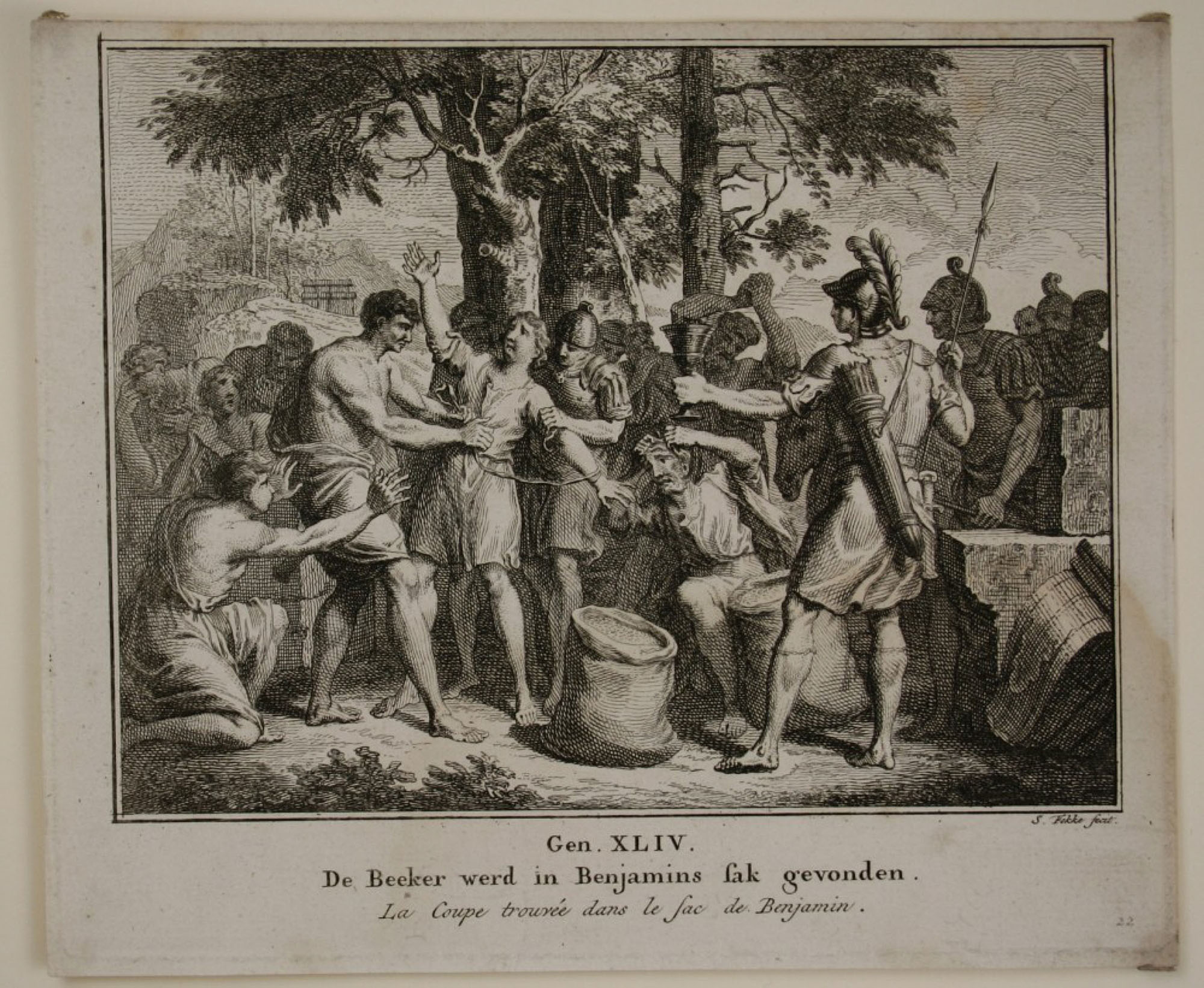 - Beschreibung: Kupferstich von Simon Fokke, bezeichnet unten rechts: “S. Fokke fecit”, darunter: “Gen. XLIV. De Beeker werd in Benjamins sak gevonden. La Coupe trouvée dans le sac de Benjamin”. Inmitten seiner aufgebrachten Brüder binden zwei Männer Benjamin. Triumphierend hält ein weiterer den silbernen Becher als Beweisstück in die Höhe. Die Brüder hatten bei ihrem Bruder Josef übernachtet, der sich ihnen aber nicht zu erkennen gegeben hatte. Er wollte prüfen, ob sich seine Brüder gebessert hätten und gab vor, bestohlen worden zu sein. Als sich die Brüder leidenschaftlich für Benjamin einsetzten war er gerührt, offenbarte seinen Namen und beschenkte sie. Simon Fokke (Amsterdam 1712 – Amsterdam 1784) war niederländischer Zeichner, Kupferstecher und Radierer.