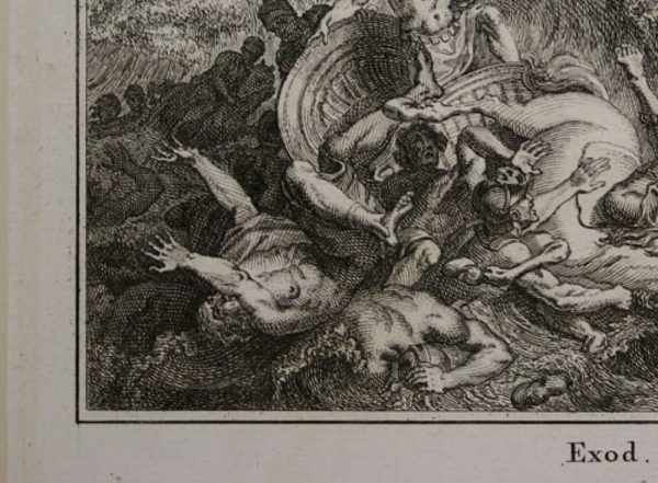 - Beschreibung: Kupferstich von Simon Fokke, bezeichnet unten rechts: “S. Fokke fec.”, darunter: ” Exod. XIV. Pharao en zyn Heir verdrinken in de Roode Zee. Pharaon & son Armée engloutis dans la Mer rouge”. In hohen Wogen versinkt das ägyptische Heer mit seinem Pharao, am sicheren Ufer steht Moses mit dem Volk Israel. Simon Fokke (Amsterdam 1712 – Amsterdam 1784) war niederländischer Zeichner, Kupferstecher und Radierer.