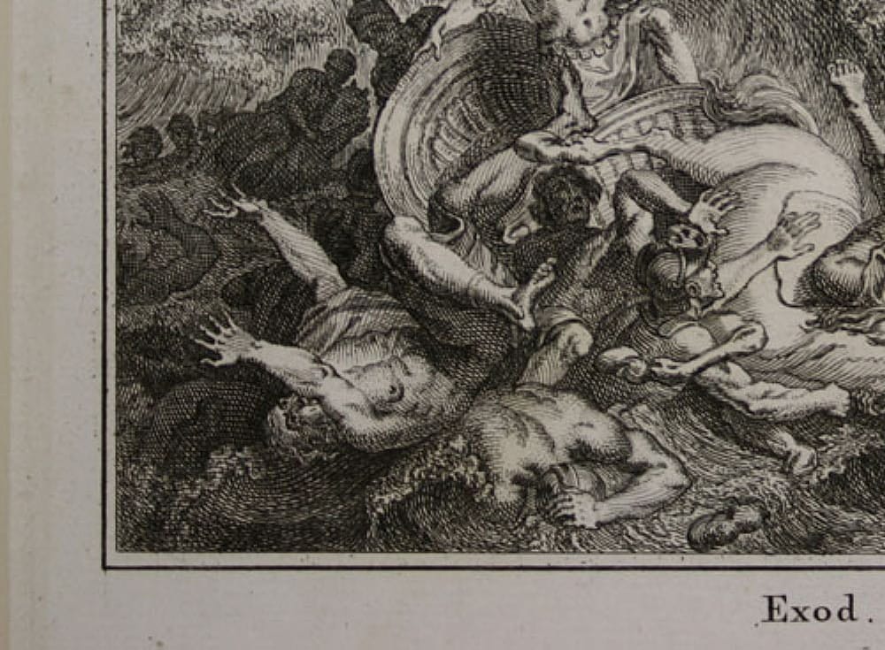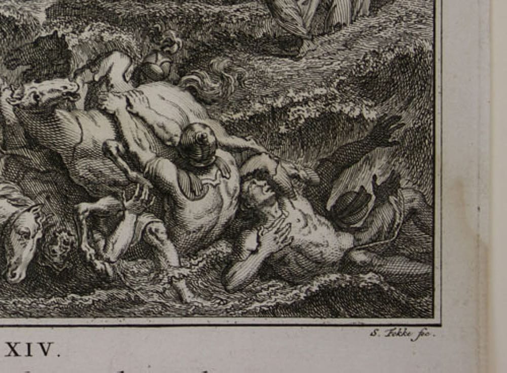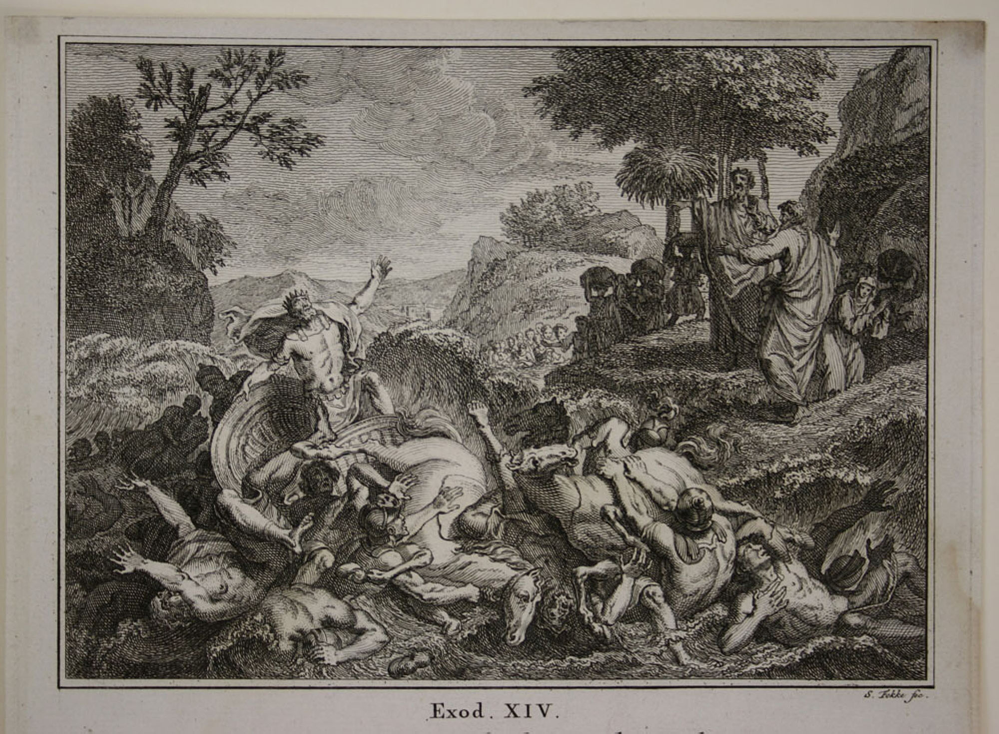 - Description: Engraving by Simon Fokke, inscribed lower right: “S. Fokke fec.”, below: ” Exod. XIV Pharao en zyn Heir verdrinken in de Roode Zee. Pharaon & son Armée engloutis dans la Mer rouge”. In high waves the Egyptian army sinks with its Pharaoh, on the safe shore Moses stands with the people of Israel. Simon Fokke (Amsterdam 1712 – Amsterdam 1784) was a Dutch draftsman, engraver and etcher.