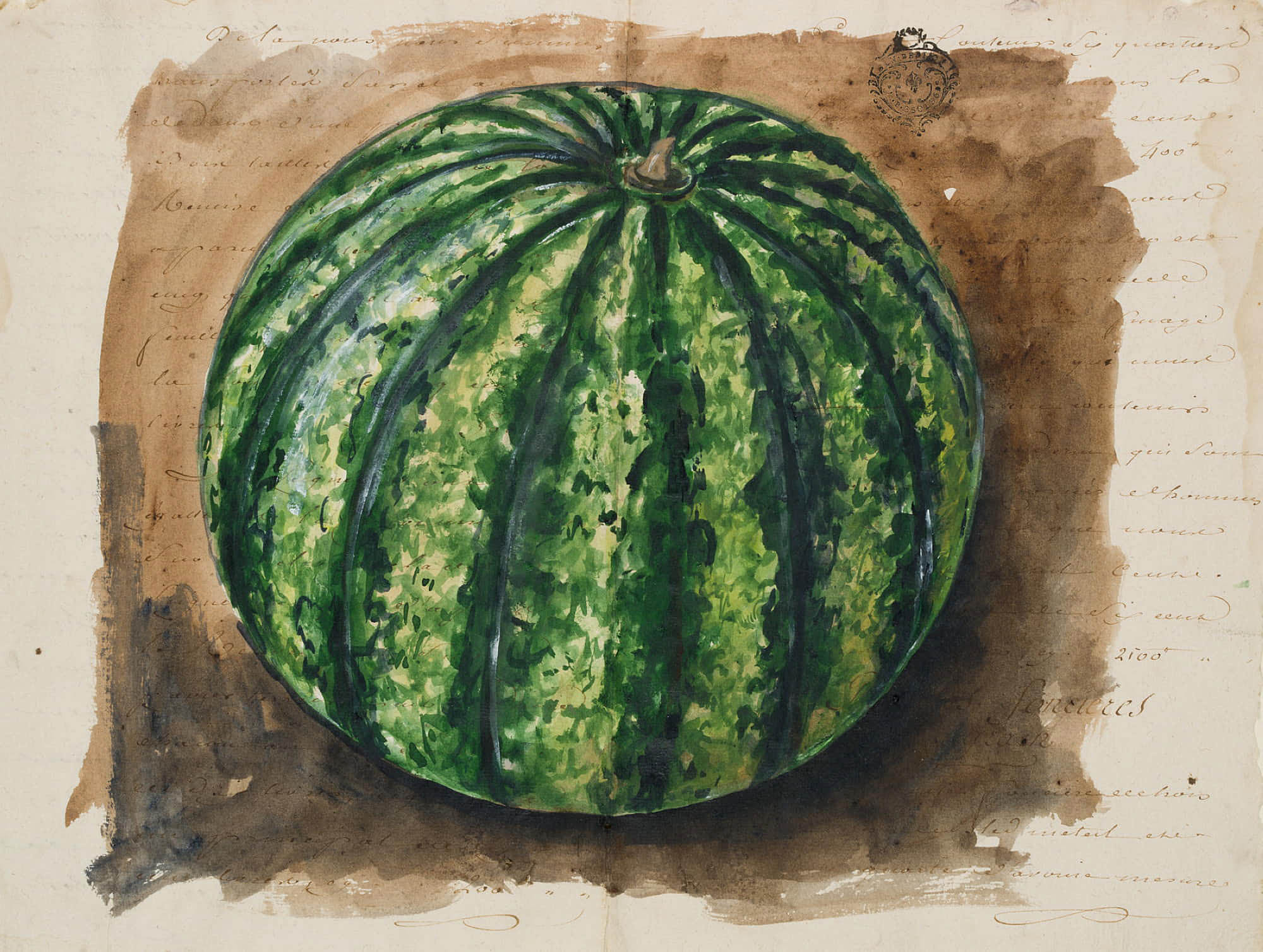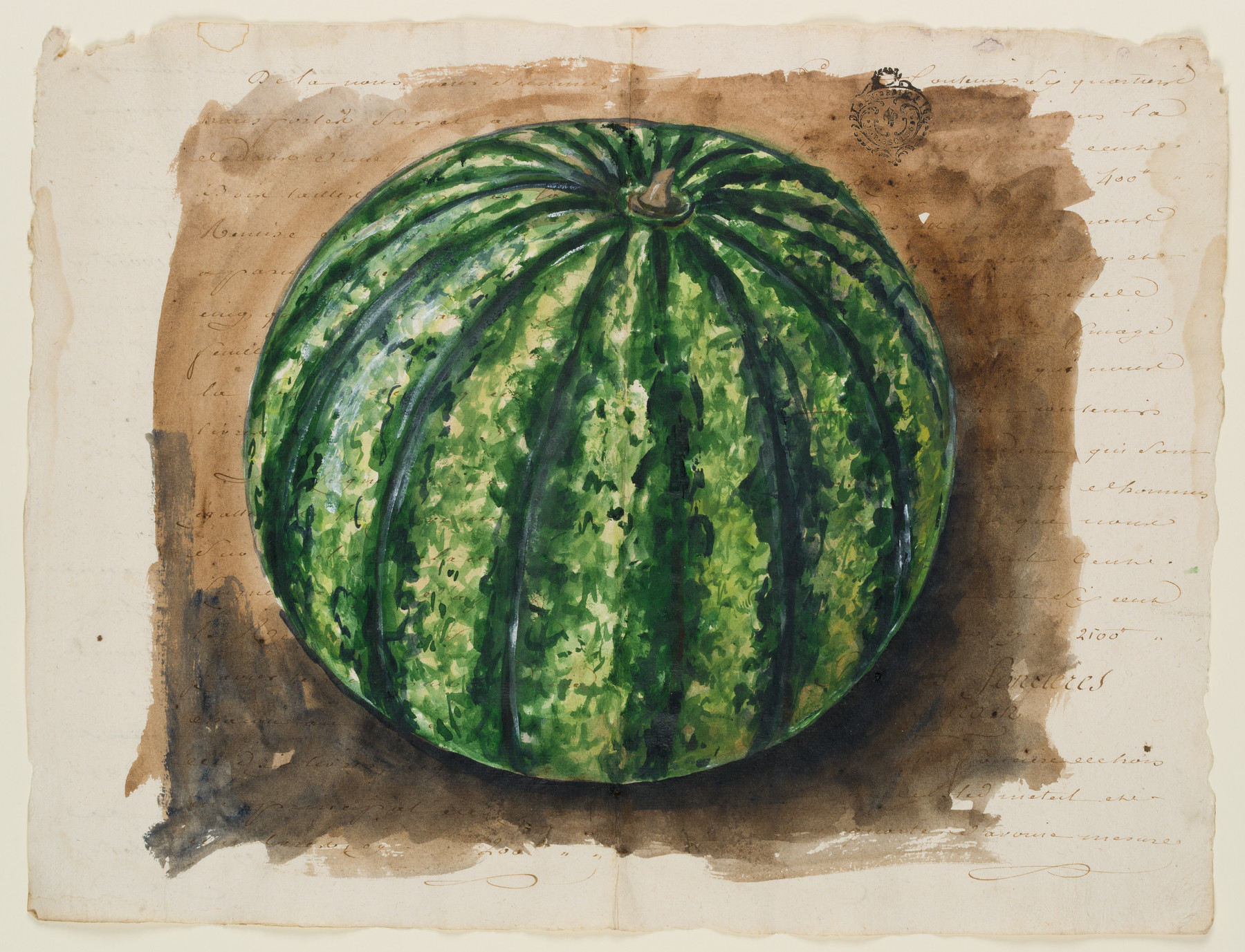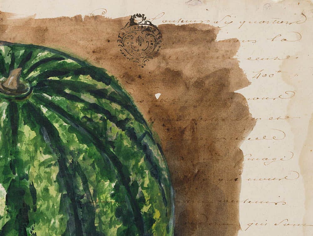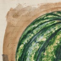 - Beschreibung: Dieses Gemälde schuf die Nürnbergerin Sabine Frank (geb. 1956) wohl um 2000 in Italien. Auf einem mit brauner Feder beschriebenen Dokument aus dem 18. Jahrhundert ist eine mit Acrylfarben ausgeführte Wassermelone von frischer grüner Farbigkeit zu sehen.