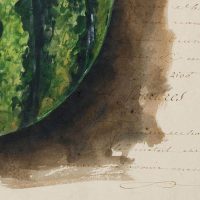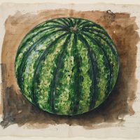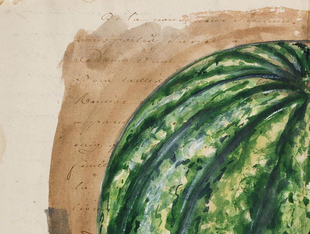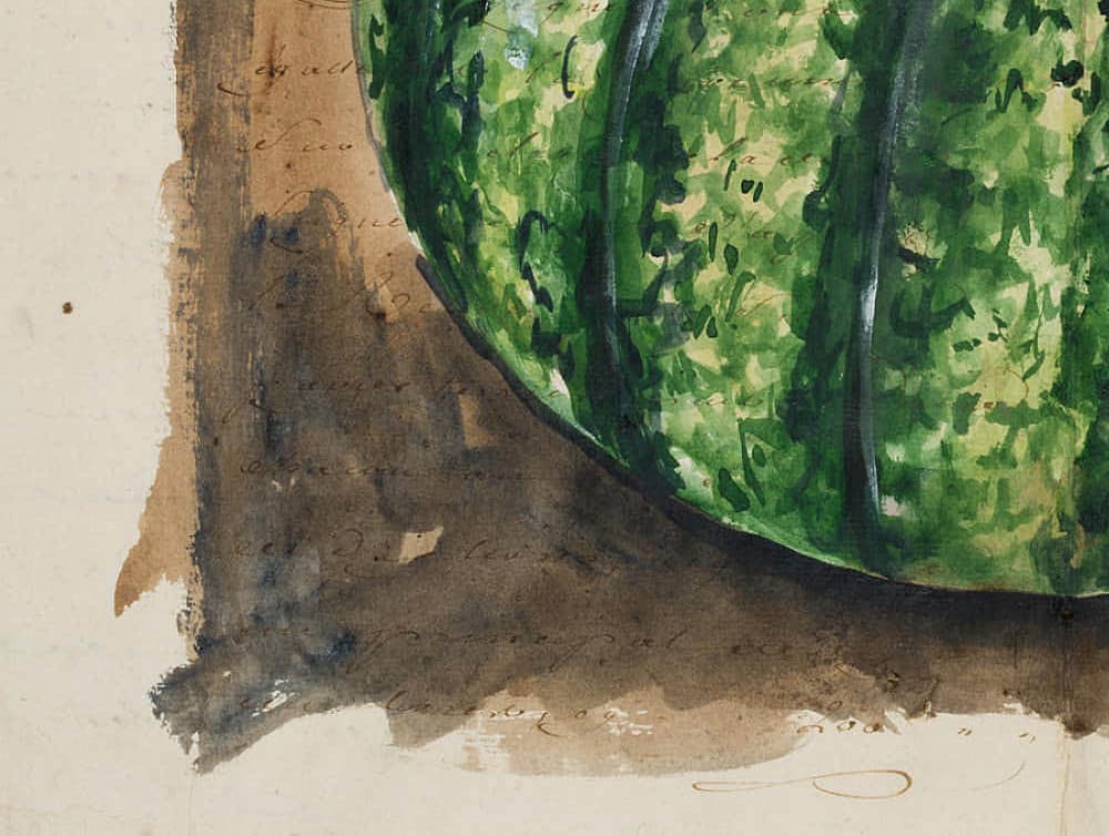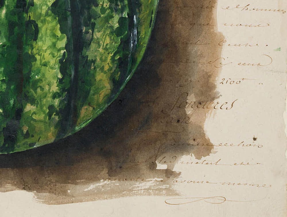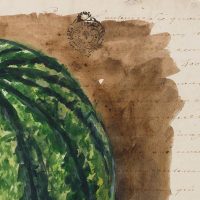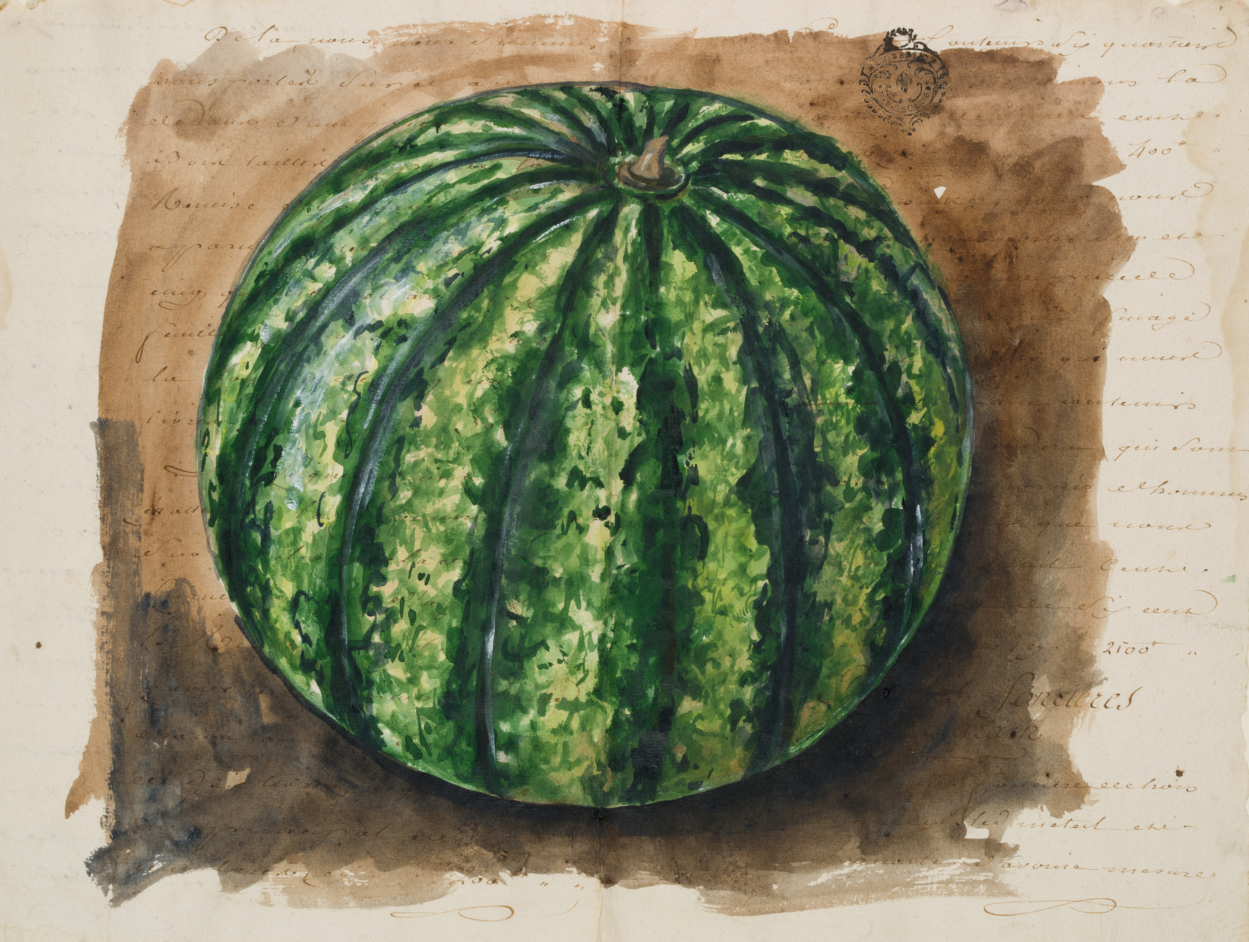 - Beschreibung: Dieses Gemälde schuf die Nürnbergerin Sabine Frank (geb. 1956) wohl um 2000 in Italien. Auf einem mit brauner Feder beschriebenen Dokument aus dem 18. Jahrhundert ist eine mit Acrylfarben ausgeführte Wassermelone von frischer grüner Farbigkeit zu sehen.