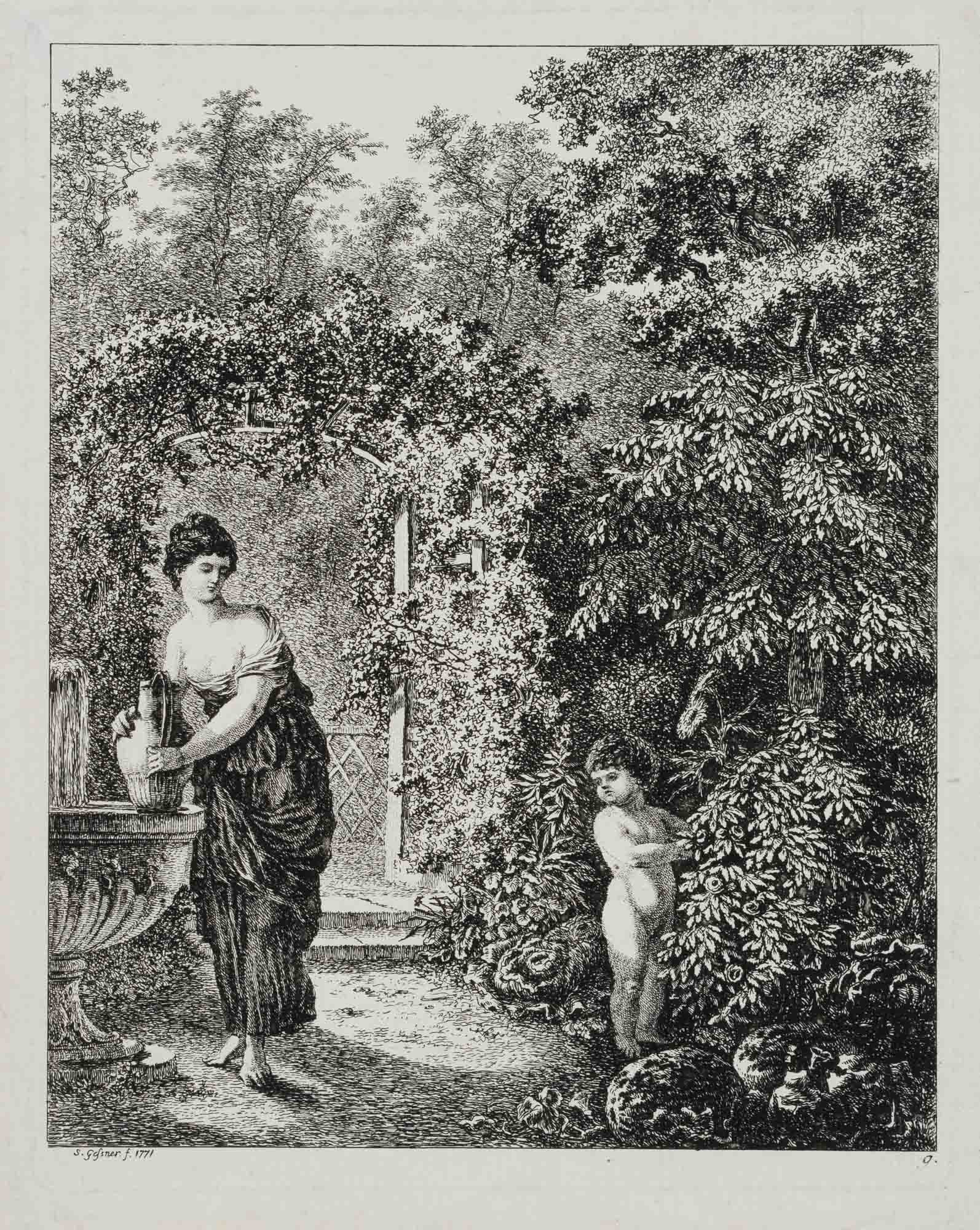 S. GESSNER (1730-1788), Amor mit junger Frau am Brunnen im Garten, 1771, Rad.