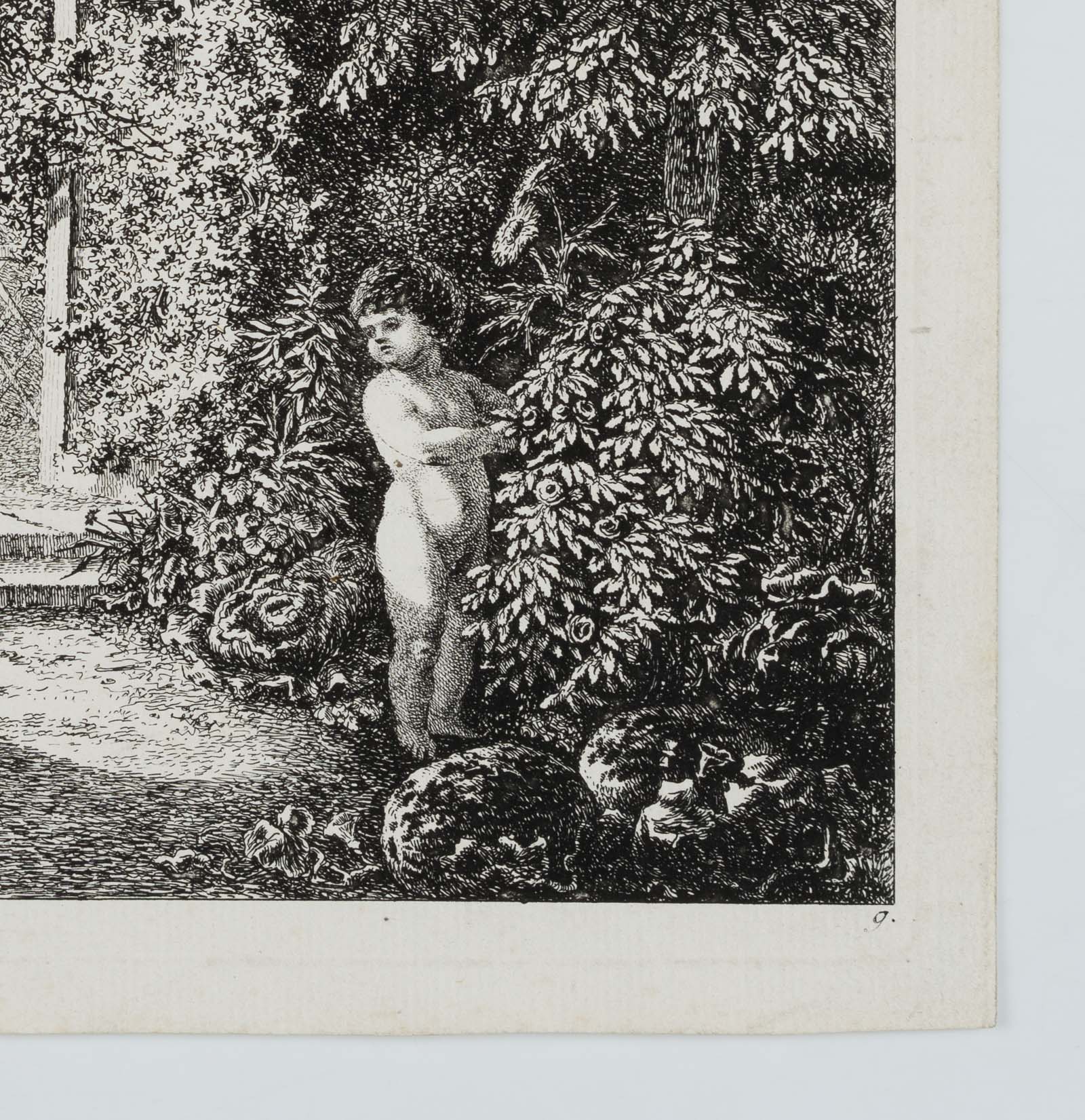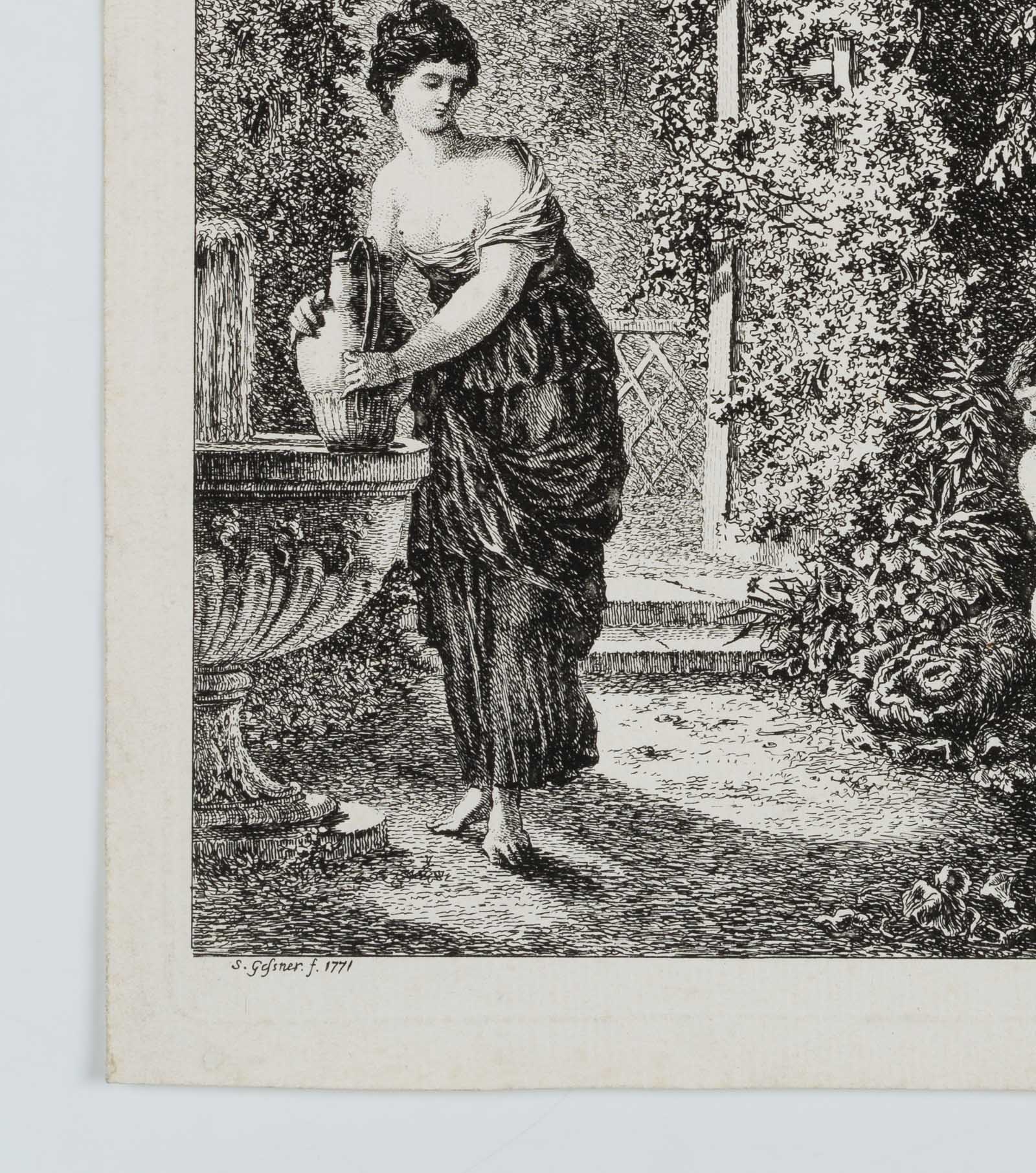 Salomon Gessner (1730 Zurich – 1788 ibid.), Cupid with young woman at the fountain in the garden, 1771, Etching