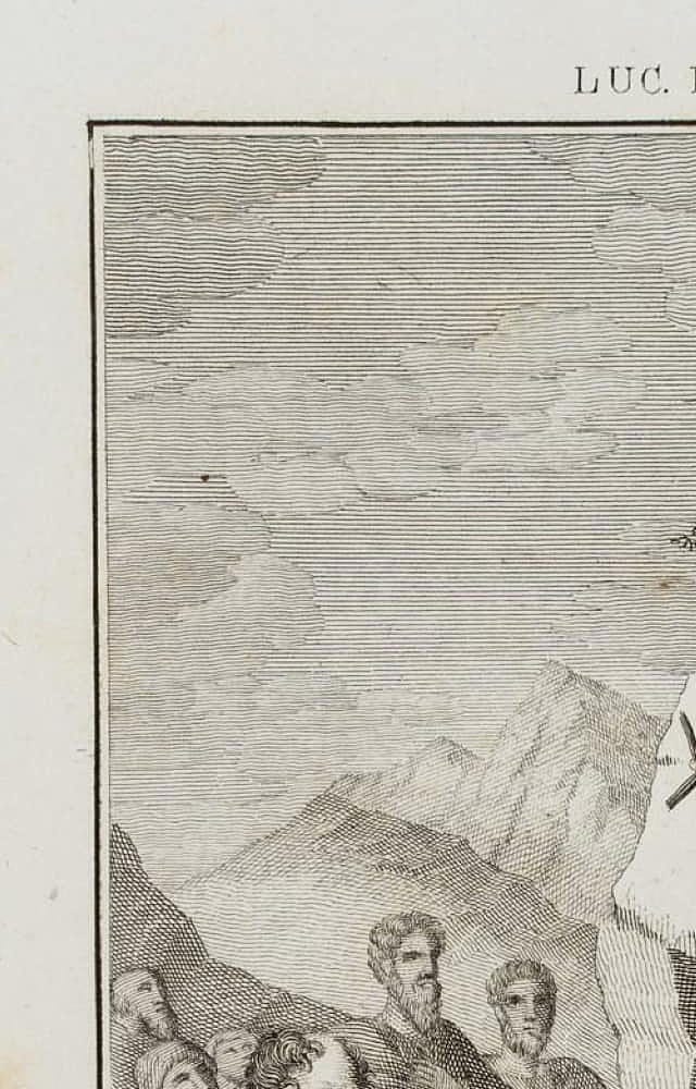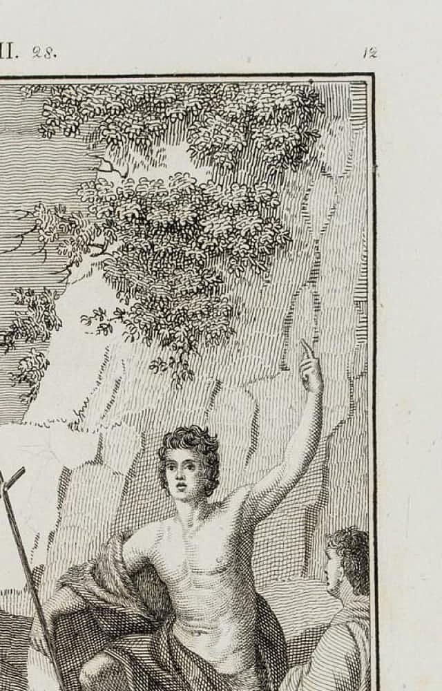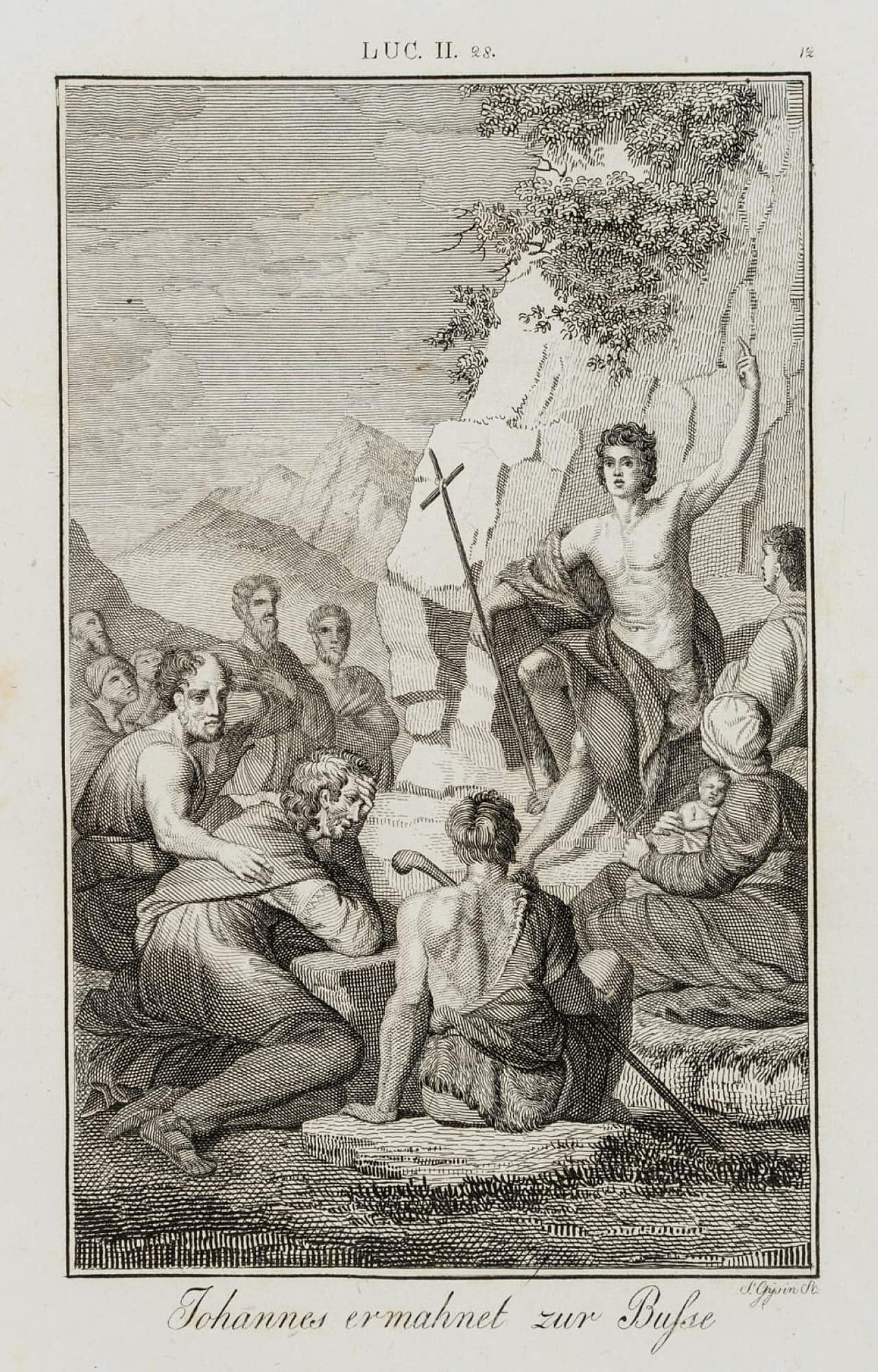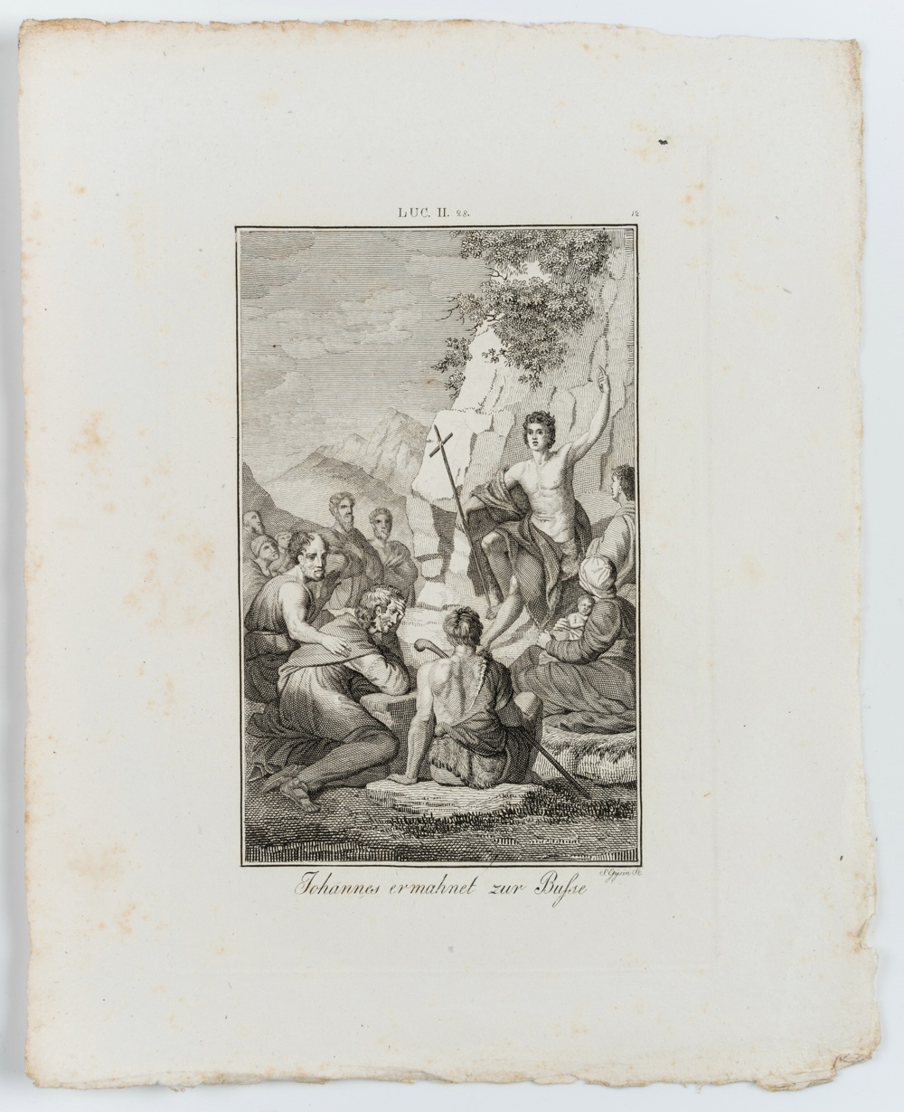- Description: Inscribed above and below the image in the printing plate. Signed by the artist lower right. Showing a scenic depiction of John preaching at a rock. Illustration to the biblical passage Luke 2, 28[?]. The illustration is from Die Heiligen Schriften des Neuen Testaments in Hundert Biblischen Kupfern dargestellt | Gestochen unter der Leitung von Carl Schuler | Freiburg in der Herder’sche Kunst und Buchhandlung, published c. 1820.
