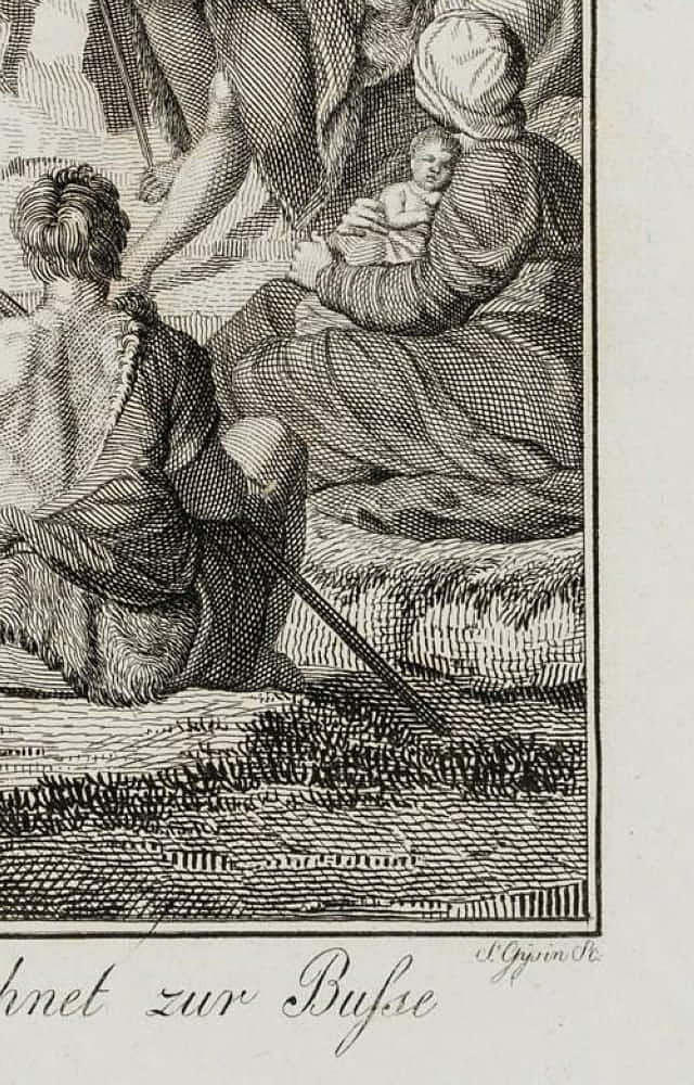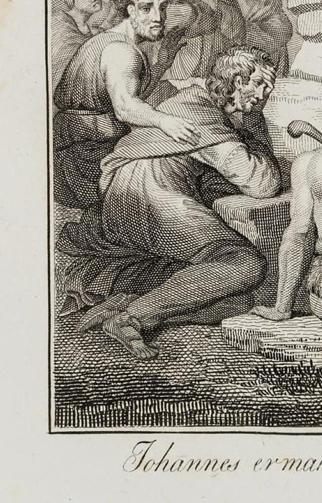 - Beschreibung: Oberhalb und unterhalb der Darstellung in der Druckplatte bezeichnet. Unten rechts vom Künstler signiert. Zeigt eine szenische Darstellung des predigenden Johannes an einem Felsen. Illustration zu der Bibelstelle Lukas 2, 28[?]. Die Darstellung stammt aus Die Heiligen Schriften des Neuen Testaments in Hundert Biblischen Kupfern dargestellt | Gestochen unter der Leitung von Carl Schuler | Freiburg in der Herder’schen Kunst und Buchhandlung, erschienen um 1820.