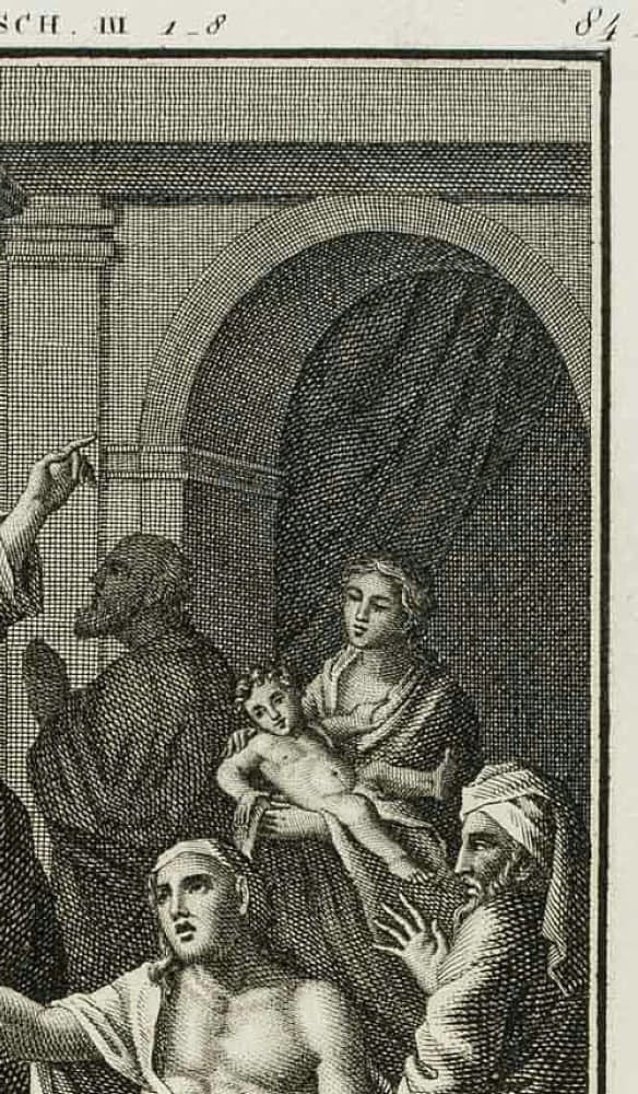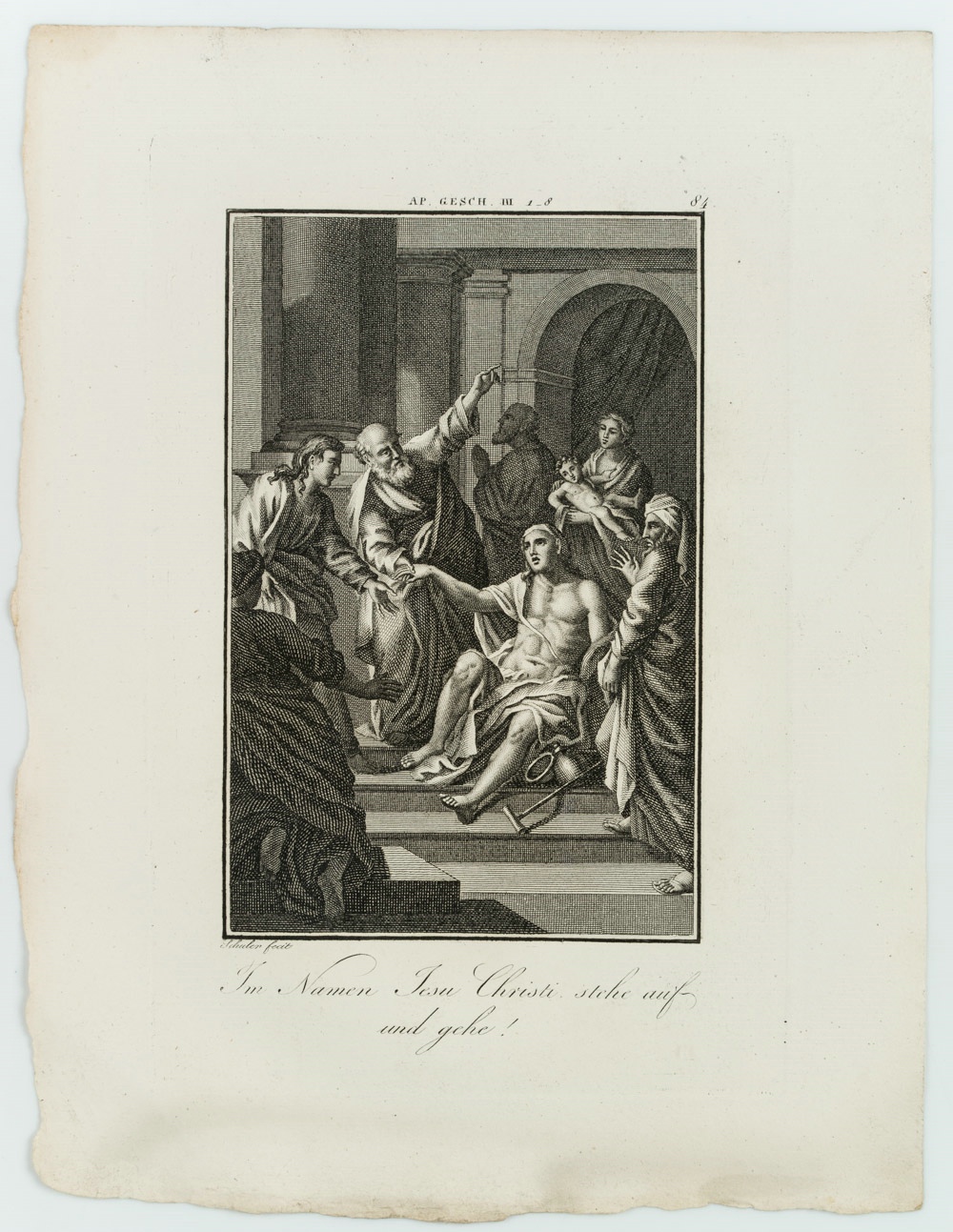 • Description: Showing the miraculous scene in which Peter and John heal a paralytic. Illustration of the biblical passage Acts 3, 1-8. The illustration comes from Die Heiligen Schriften des Neuen Testaments in Hundert Biblischen Kupfern dargestellt | Gestochen unter der Leitung von Carl Schuler | Freiburg in der Herder’sche Kunst und Buchhandlung, published around 1820.