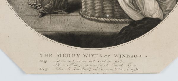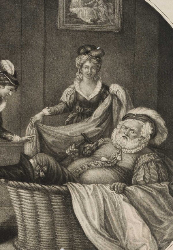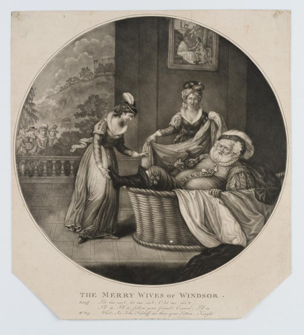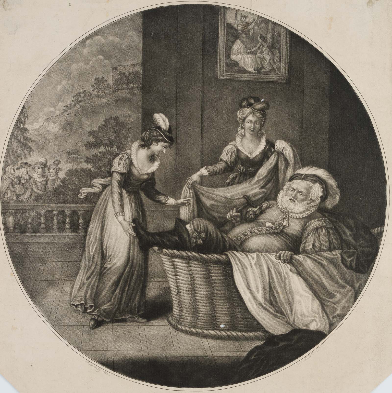 - Description: Cheerful scene from Shakespeare’s comedy The Merry Wives of Windsor . The sturdy Falstaff hides in the laundry basket from the approaching Mr. Ford with his friends.