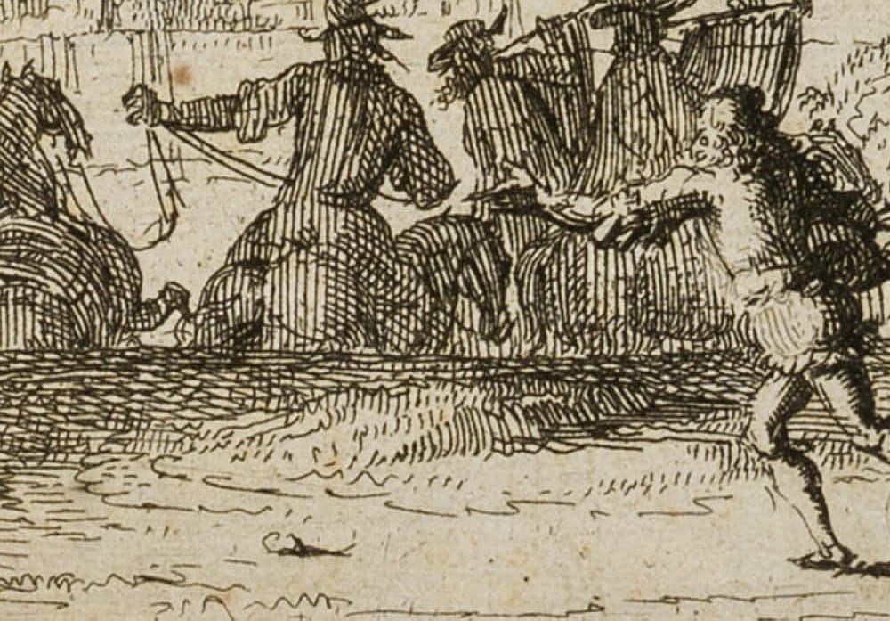 • Beschreibung: Leclercs Werke standen unter dem Einfluss von Jacques Callot. Wie Callot widmete sich Leclerc unter Anderem der Darstellung von Schlachtenszenen. Auf dem vorliegenden Blatt sehen wir einen General zu Pferd, der in der Ferne eine Stadt gesichtet hat. Mit einem Zeigegestus gibt er seiner Truppe das Signal zum Angriff.