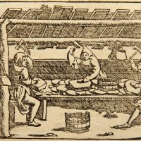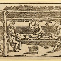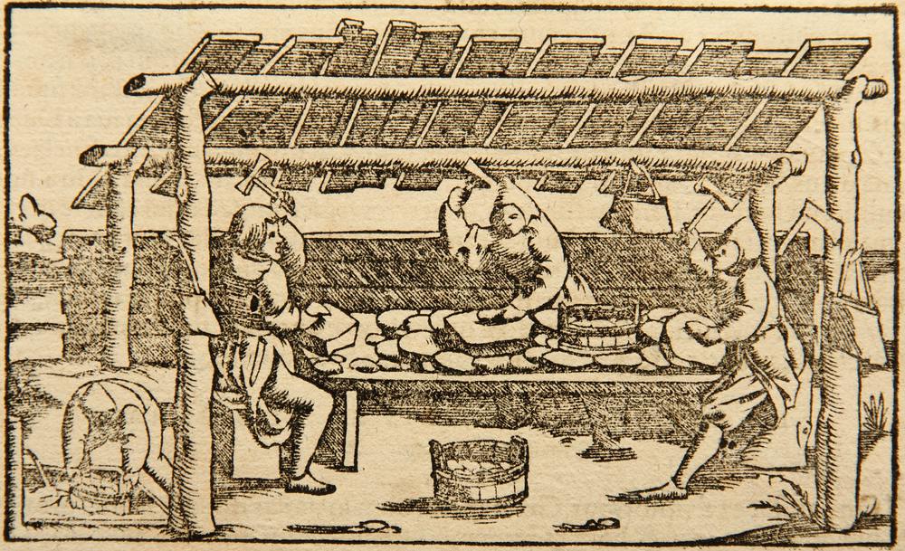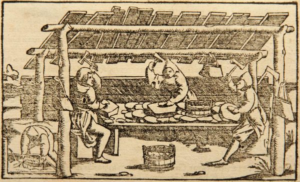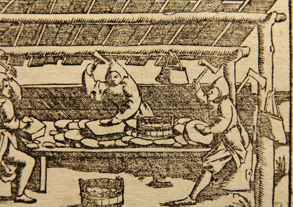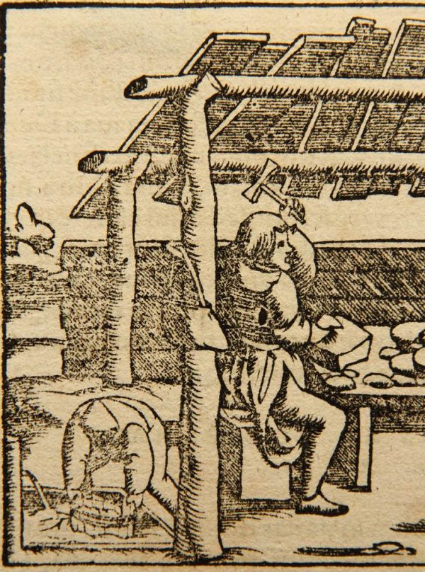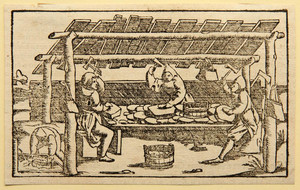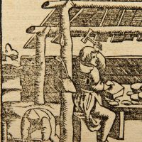 - Description: Documentary depiction of ore processing in medieval Germany. The illustration is from the Latin edition of Münster’s Cosmographia, Book III, one of the earliest descriptions of the world published in numerous languages. The Latin edition dates from around 1550 to 1570. On the reverse is a clipping of a typographical print in Latin.