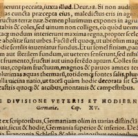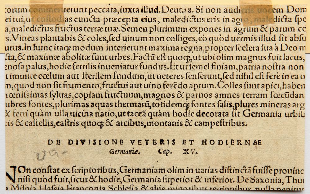- Beschreibung: Dokumentarische Darstellung der Erzverarbeitung im mittelalterlichen Deutschland. Die Illustration stammt aus der lateinischsprachigen Ausgabe von Münsters Cosmographia, Buch III. Es handelt sich um eine der frühesten Beschreibungen der Welt, die in zahlreichen Sprachen erschienen ist. Die lateinische Ausgabe stammt aus dem Zeitraum um 1550 bis 1570. Rückseitig befindet sich der Ausschnitt eines typographischen Drucks in lateinischer Sprache.