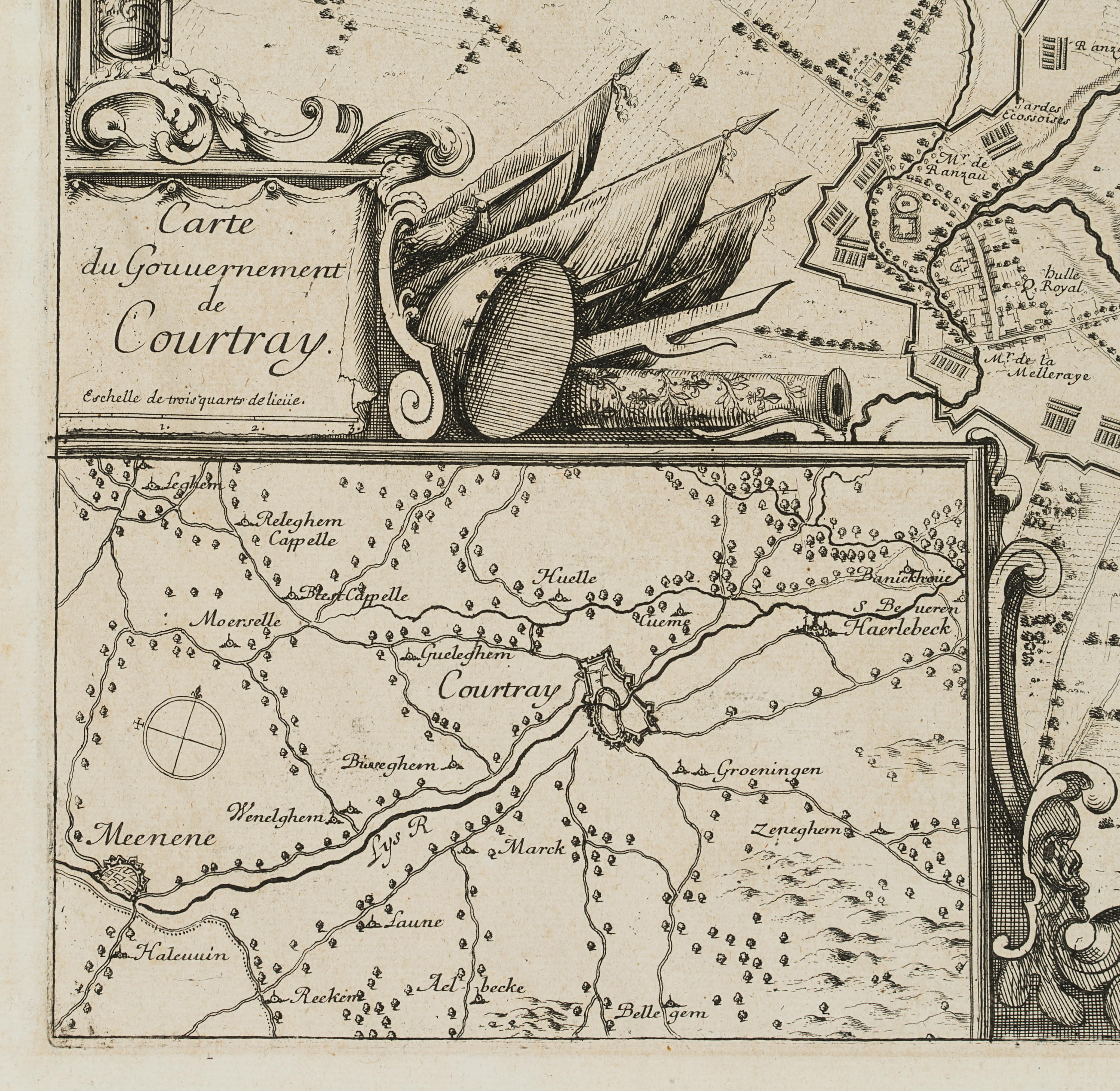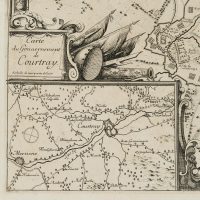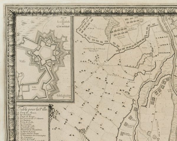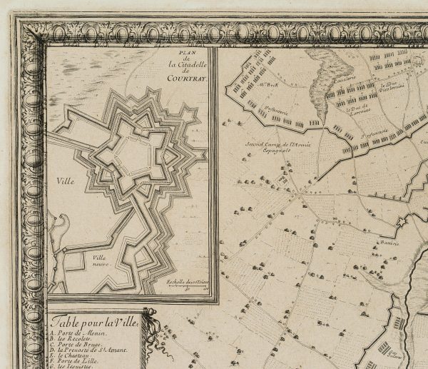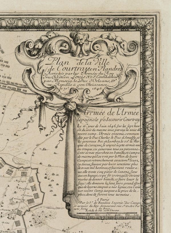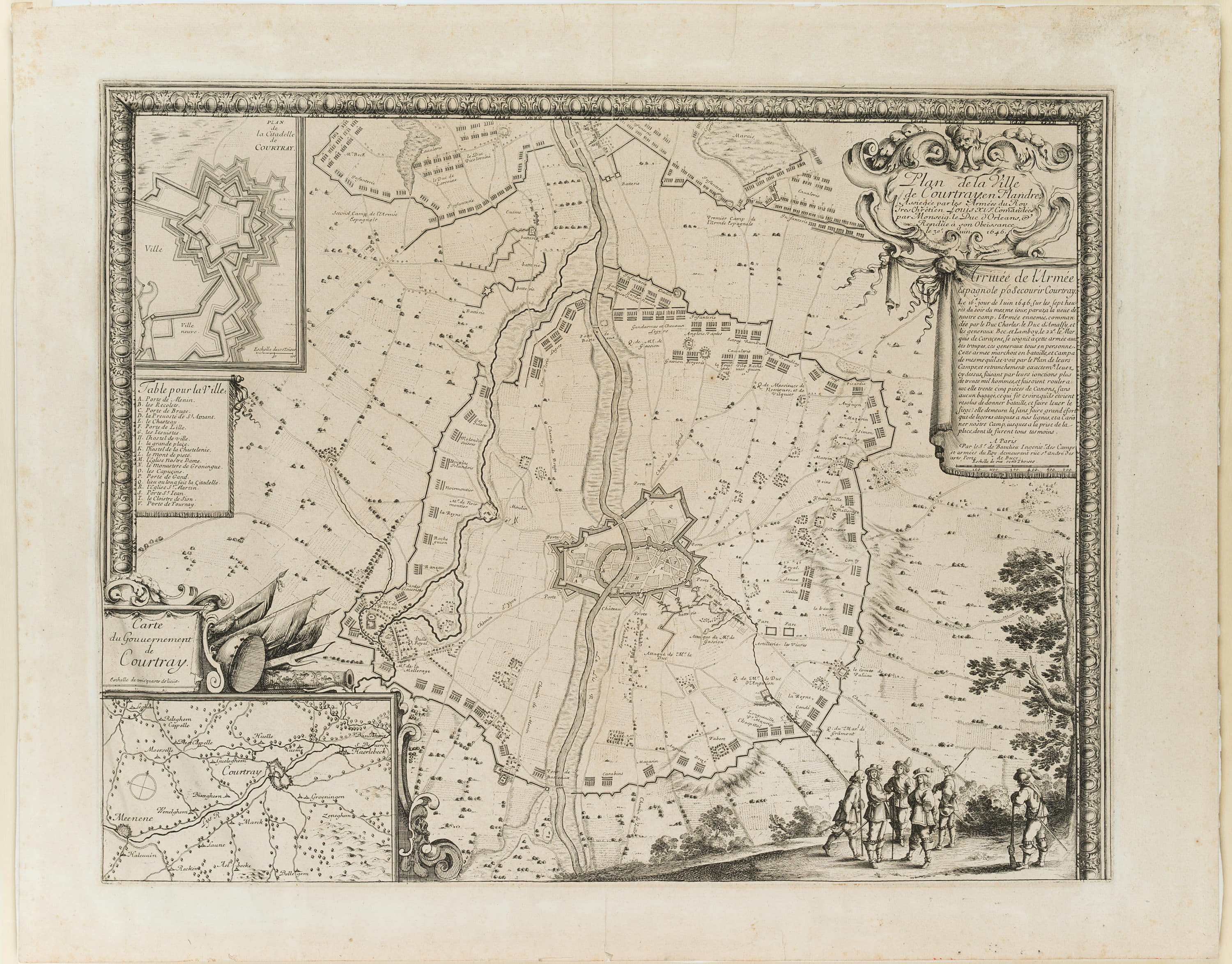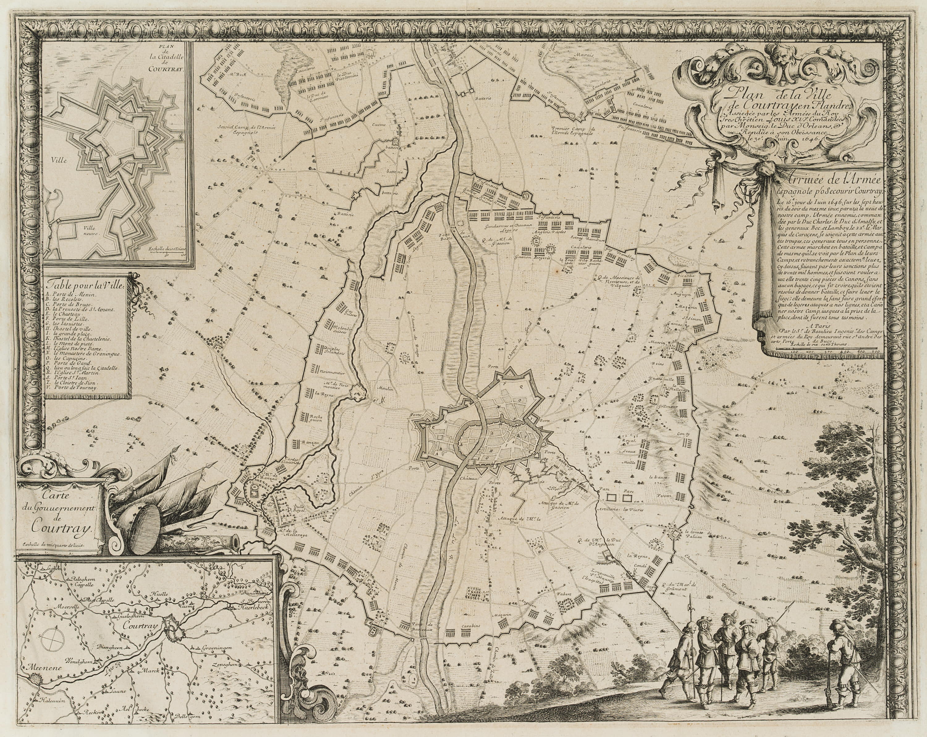 - Inscription: At the lower part signed in the printing plate: “A Paris Par le Sr. de Beaulieu Ingenier. des Camps et armées du Roy”. Inscribed in the printing plate: “Plan de la Ville de Courtray en Flandre.”.