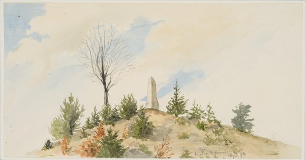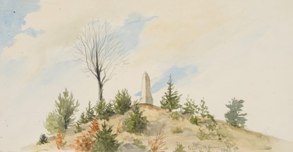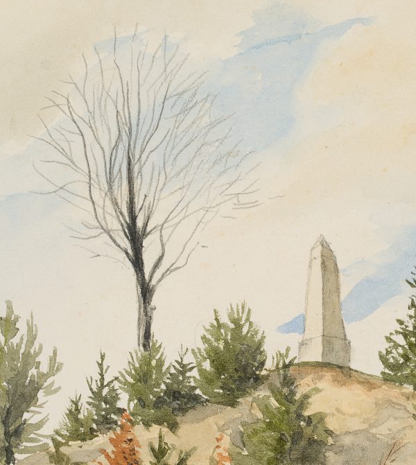 - Beschreibung: Geometrisch konstruierte Studie eines kleinen Hügels mit Postmeilensäule unter bewölktem Himmel. Die schöne Natur- und Wolkenstudie lässt den mathematischen Blick des Geographen erkennen.