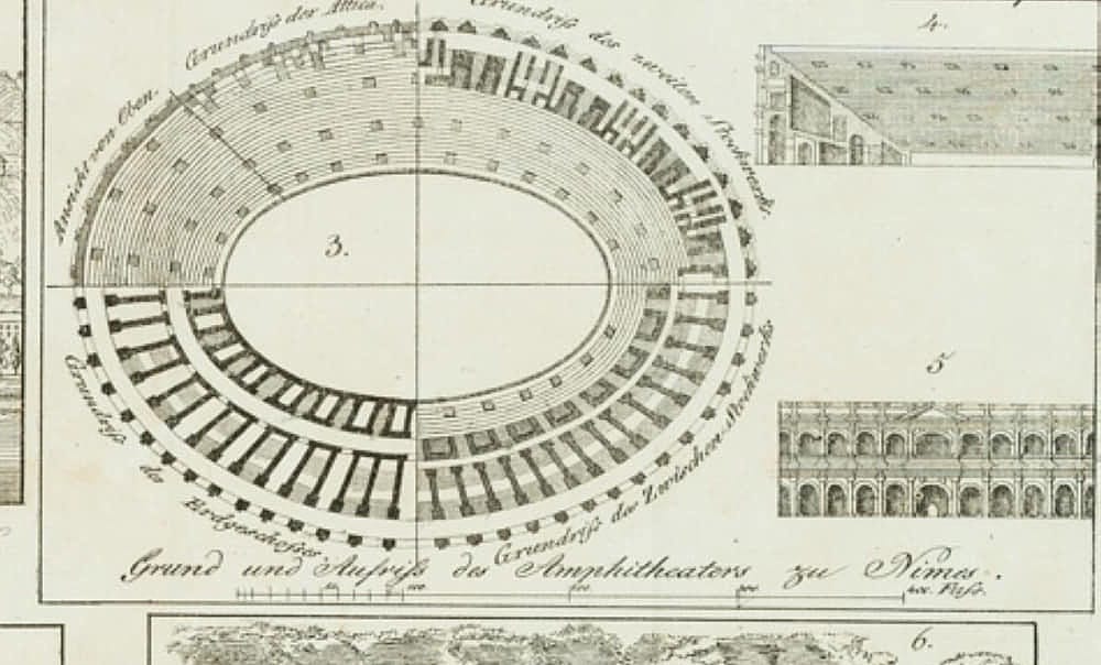 - Description: Images inscribed with titles. Sheet signed ” Sebastian Wolf 1818″ to the right of the picture of the amphitheatre. Numbered “Taf. 20” above.