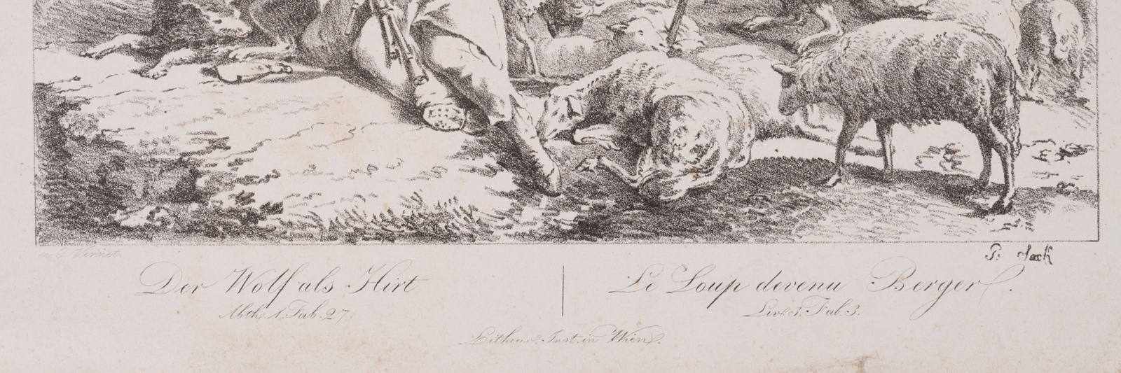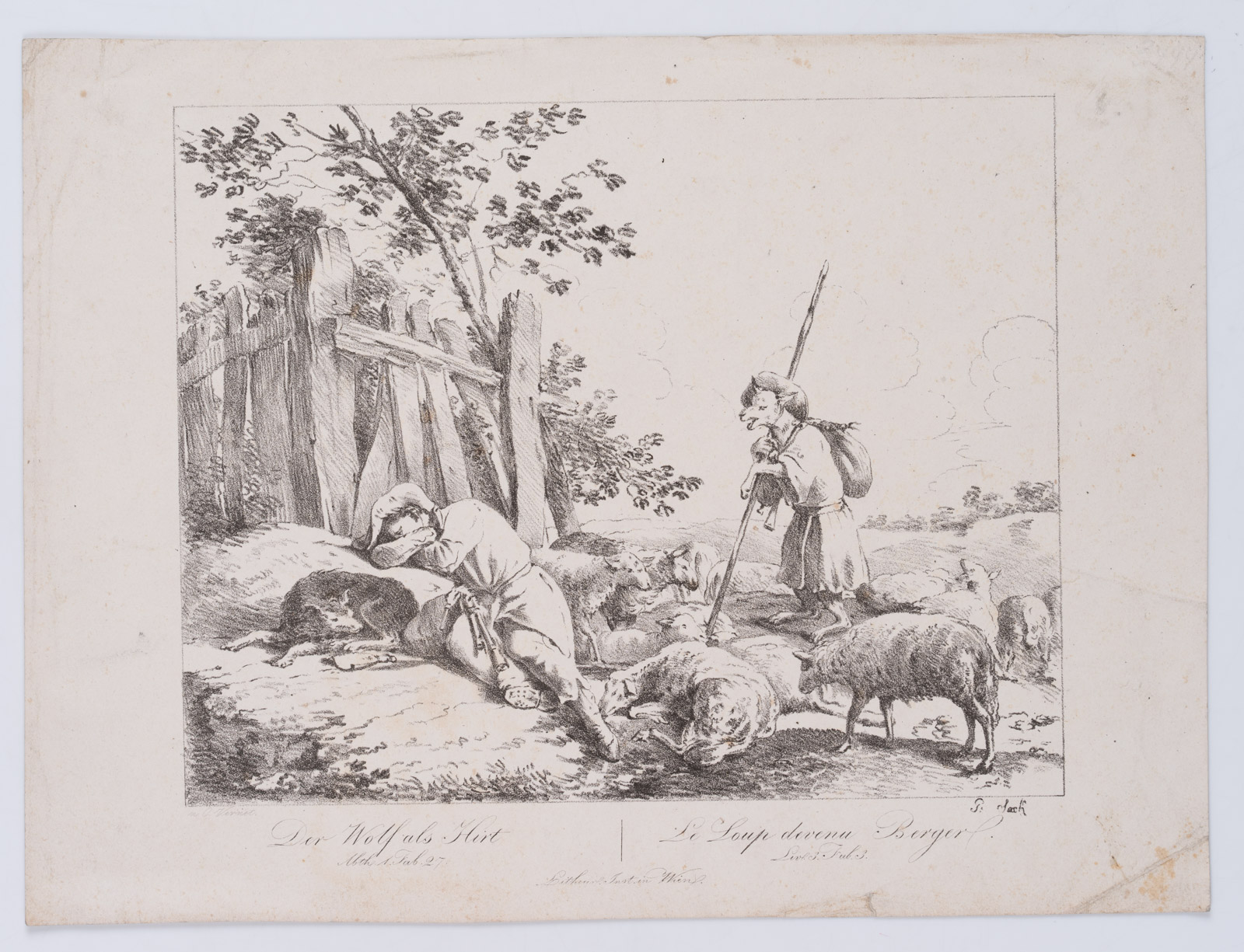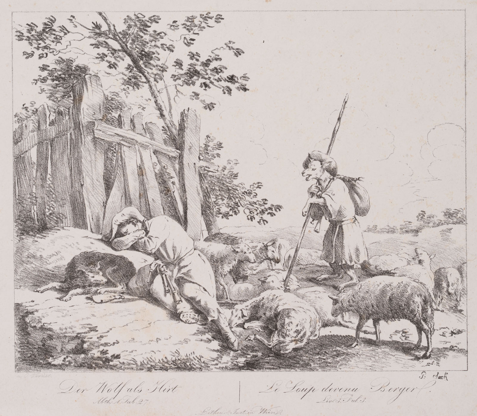 P. Sack (19. Jahrhundert) nach Claude Joseph Vernet (1714 Avignon – 1789 Paris), Der Wolf als Hirte, 19. Jahrhundert, Lithographie