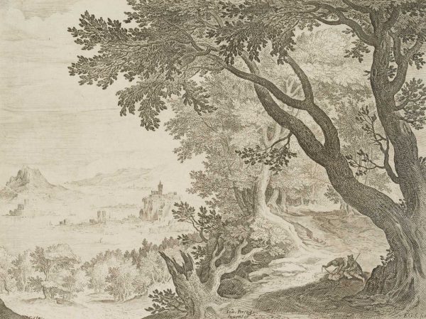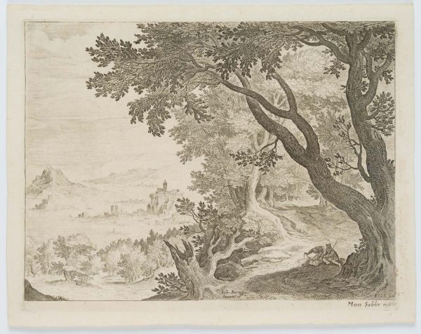 - Description: Engraving after the model by Jan Brueghel, realised by Egidius Sadeler and engraved by Marco Sadeler. It shows a landscape with two peasants resting by the roadside. In the background is a fortified harbour town.