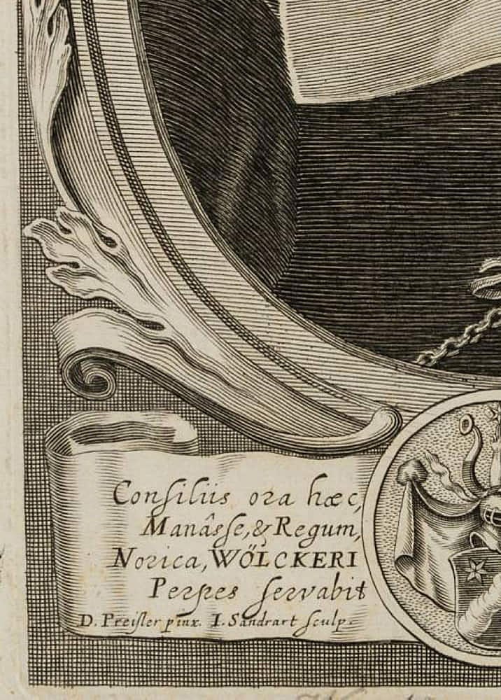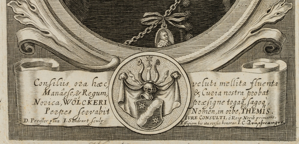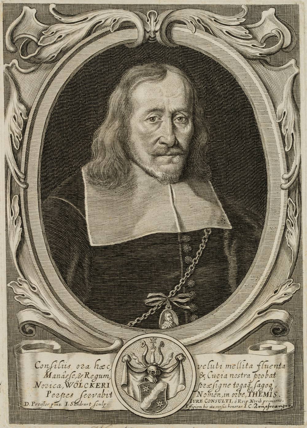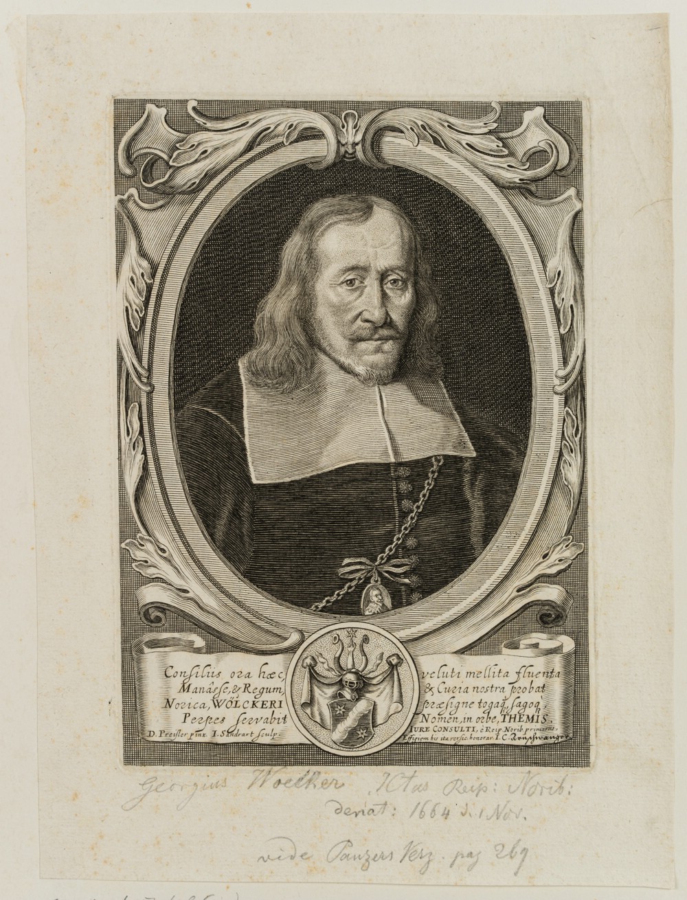 Jakob von Sandrart (1630 Frankfurt am Main – 1708 Nürnberg) nach Daniel Preissler (1627 Prag – 1665 Nürnberg), Porträt des Juristen sowie französischen und schwedischen Generalauditeurs sowie Kriegskommissars in Nürnberg Georgius Woelker (+1664), 18. Jahrhundert, Radierung