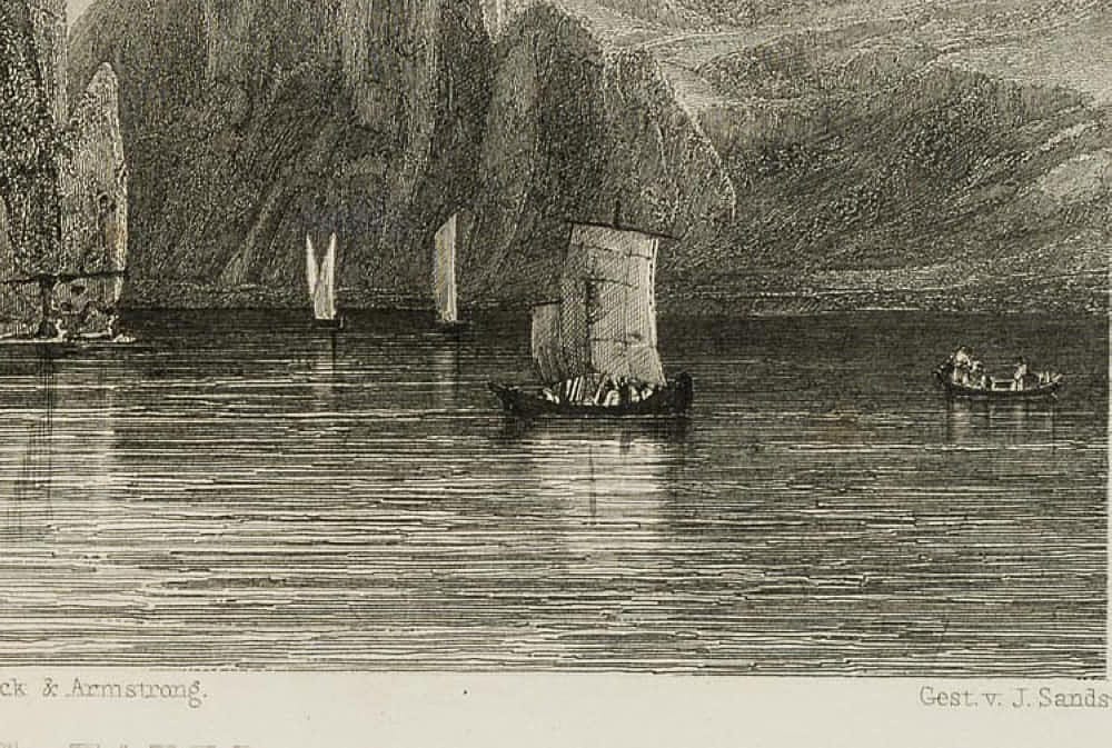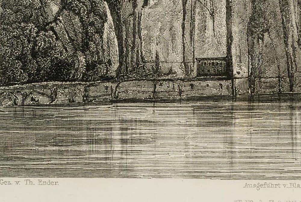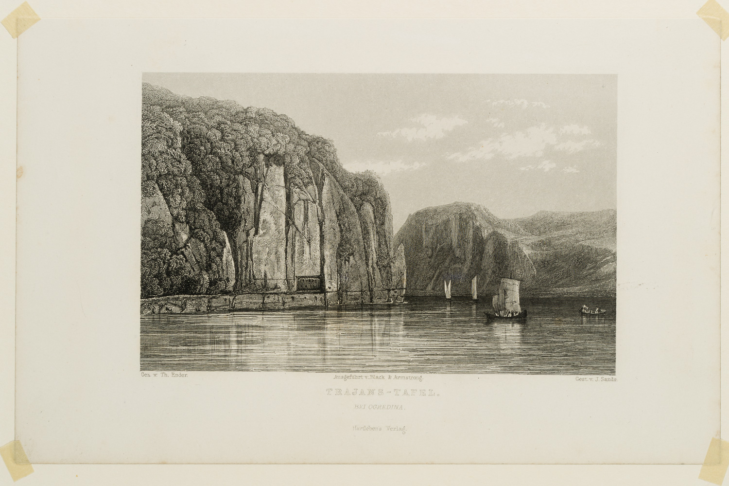 - Bezeichnung: Unterhalb mit dem Titel “TRAJANS-TAFEL. | BEI OGREDINA” bezeichnet. Links daneben mit “Gez. v. Th. Ender.” und rechts mit “Gest. v. J. Sands.” signiert.