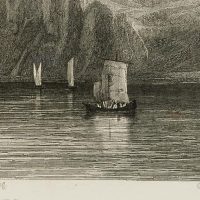 - Description: View of the river landscape of the Danube with the rock bearing the inscription of the Trajan tablet. In the foreground, sailboats float in the river.