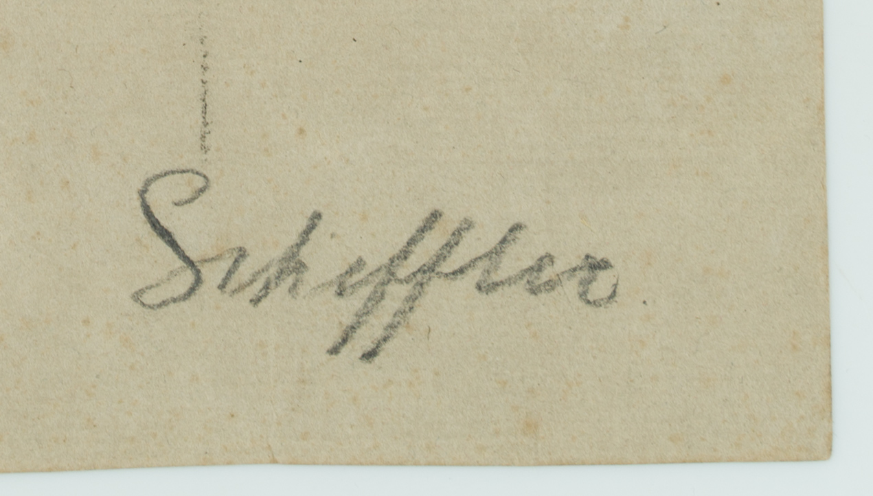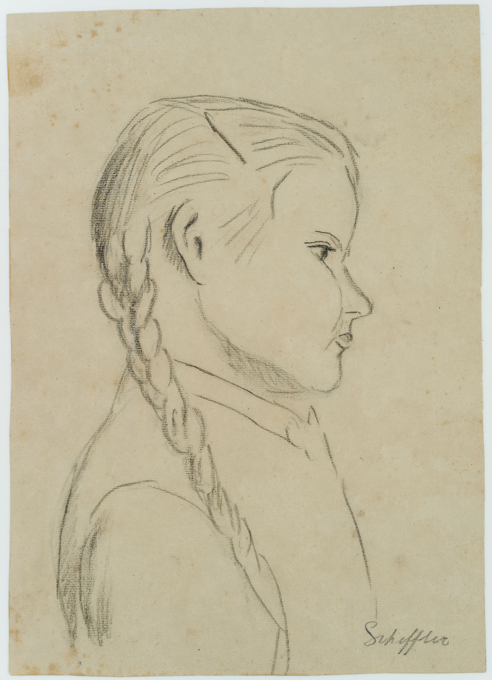 - Description: inscribed lower right below the image “Scheffler”. Portrait of a girl in lost profile. Her hair braided into a long plait, it seems as if the girl turns away from the viewers and fixes a point outside the picture space.